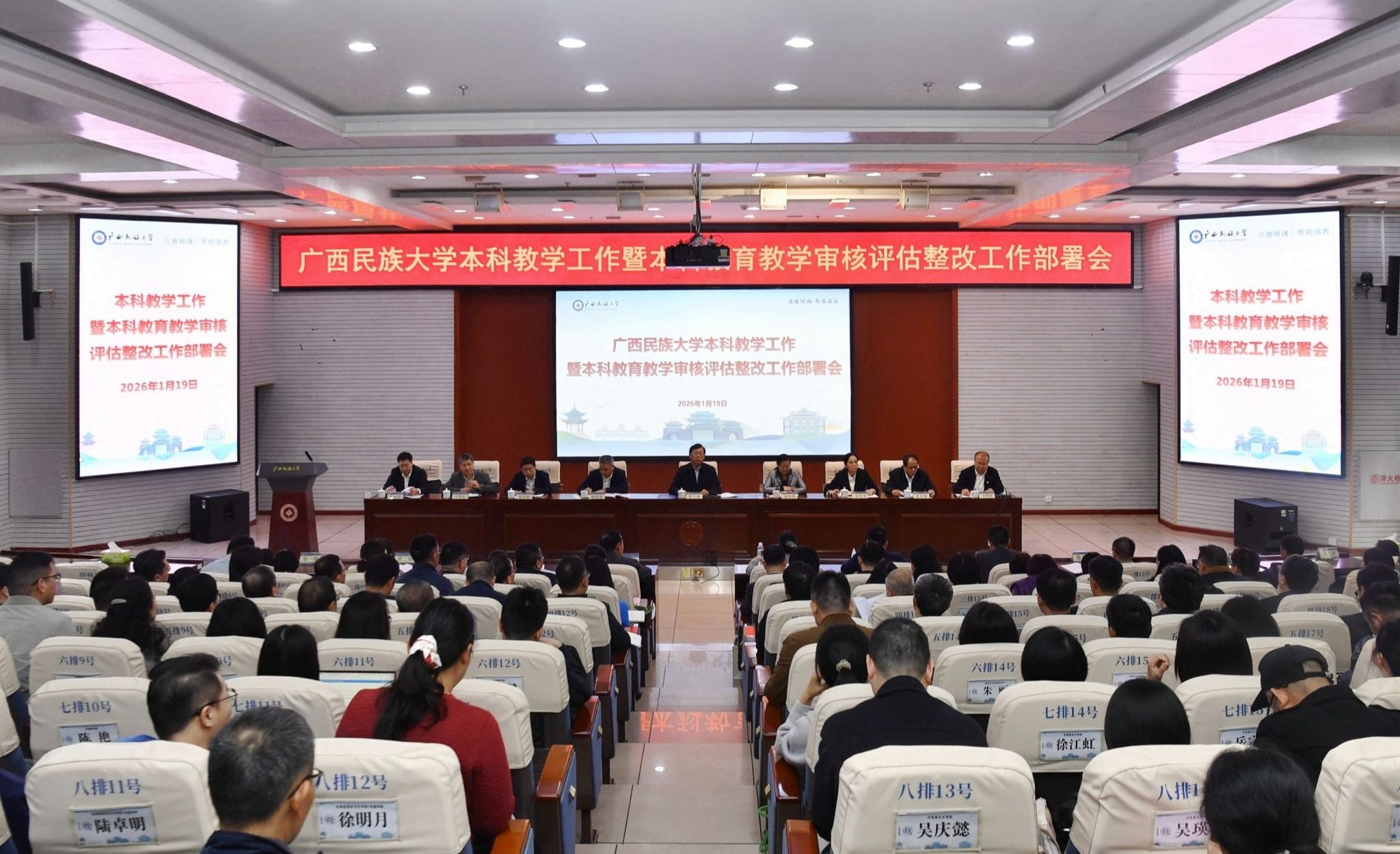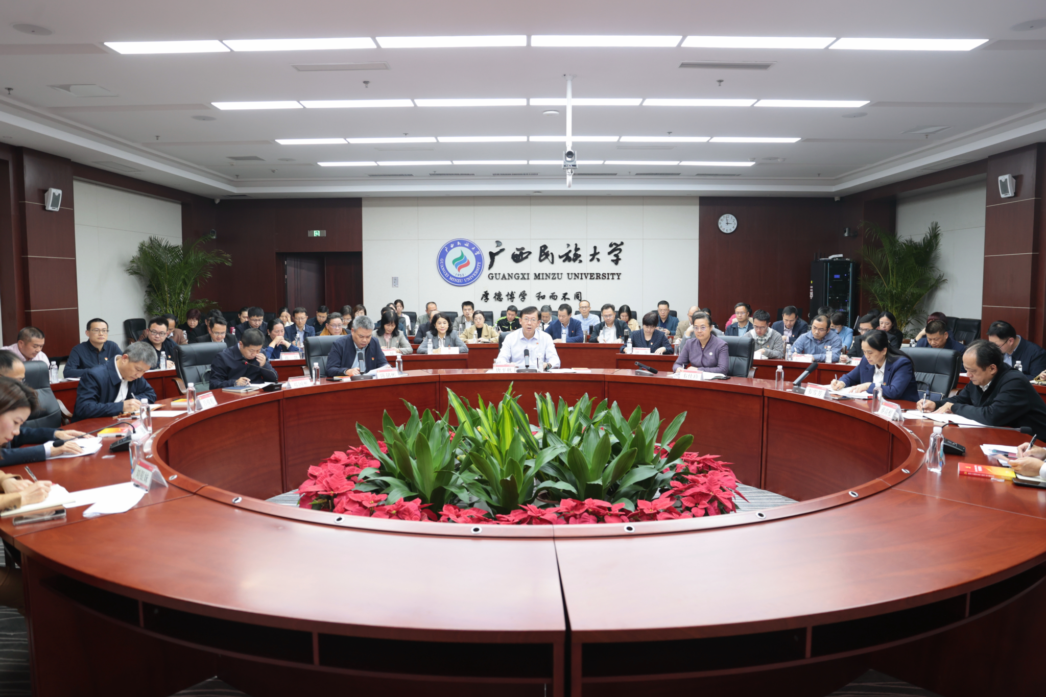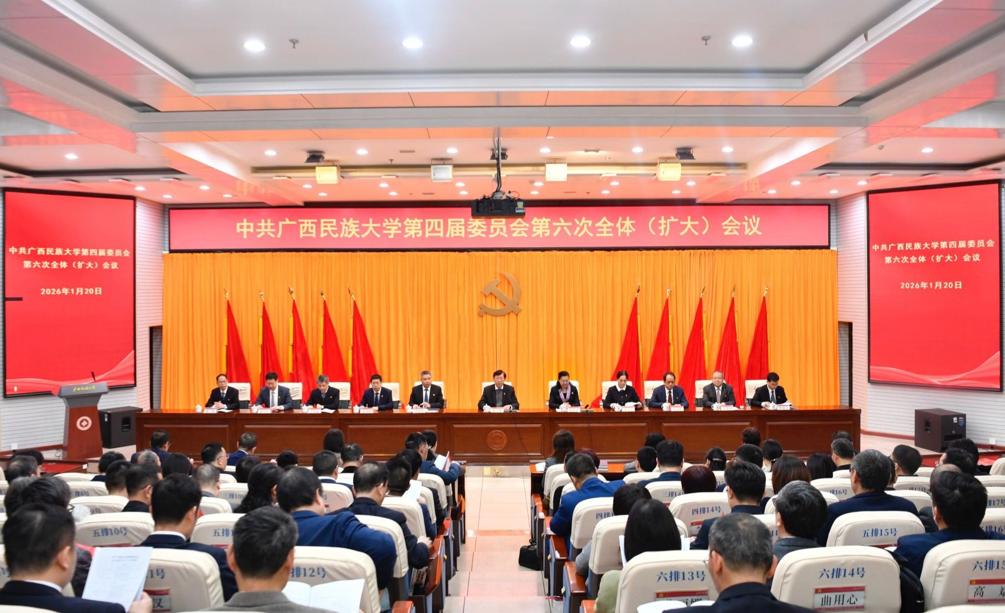 会议现场校党委书记唐平秋在会上讲话中国共产党今年会jinnian官网第四届委员会第六次全体(扩大)会议,于2026年1月20日召开。出席这次会议的有,学校党委委员23人。学校第四届纪委委员、驻校纪检监察组有关负责同志、学校党委巡察组组长、学校各单位各部门主要负责同志列席会议。全会由学校党委常委会主持。全会听取和讨论了唐平秋受党委常委会委托所作的2025年下半年工作报告,审议通过了《中共今年会jinnian官网委员会关于制定广西民族...