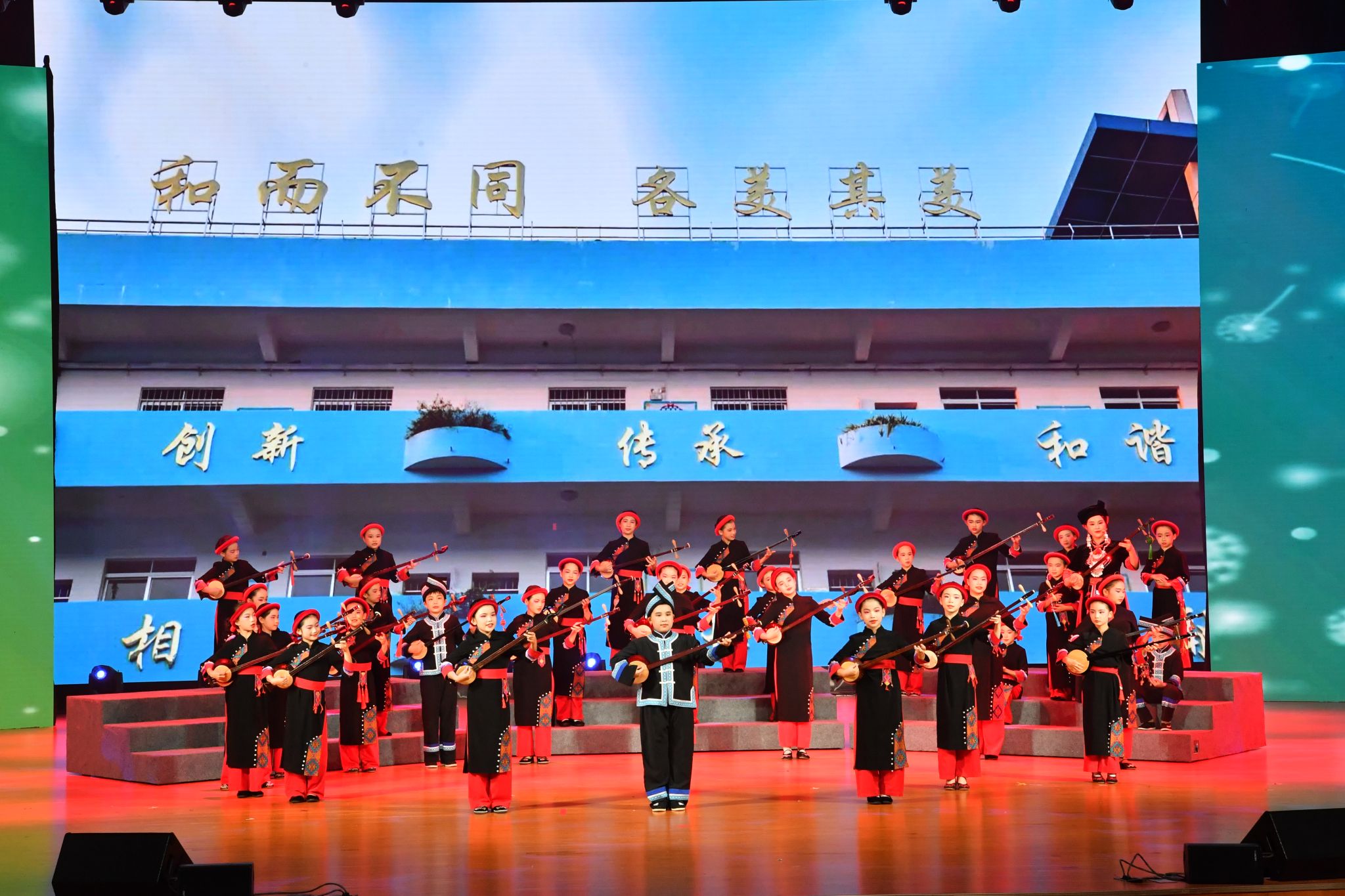 不忘初心、牢记使命。第一乐章“我们的根脉”奏响坚守热爱、传承文化的旋律。学校退休教职工们带来的原创作品《回家,我要回家》在高昂有力的歌声中表达对祖国统一的强烈愿望。民大附小的同学们带来器乐合唱《红豆少年》,清亮的童声传递着传承中华优秀传统文化的精神,彰显中华少年的风采。校艺术团带来舞蹈《传响》,舞者在铿锵的鼓点和坚定的舞步中将文化与艺术紧密结合,传递着信仰的力量与光芒。教职工带来的歌舞《理想照耀中国》启示着我们理想的光辉是指引民族伟大复兴的方向。
