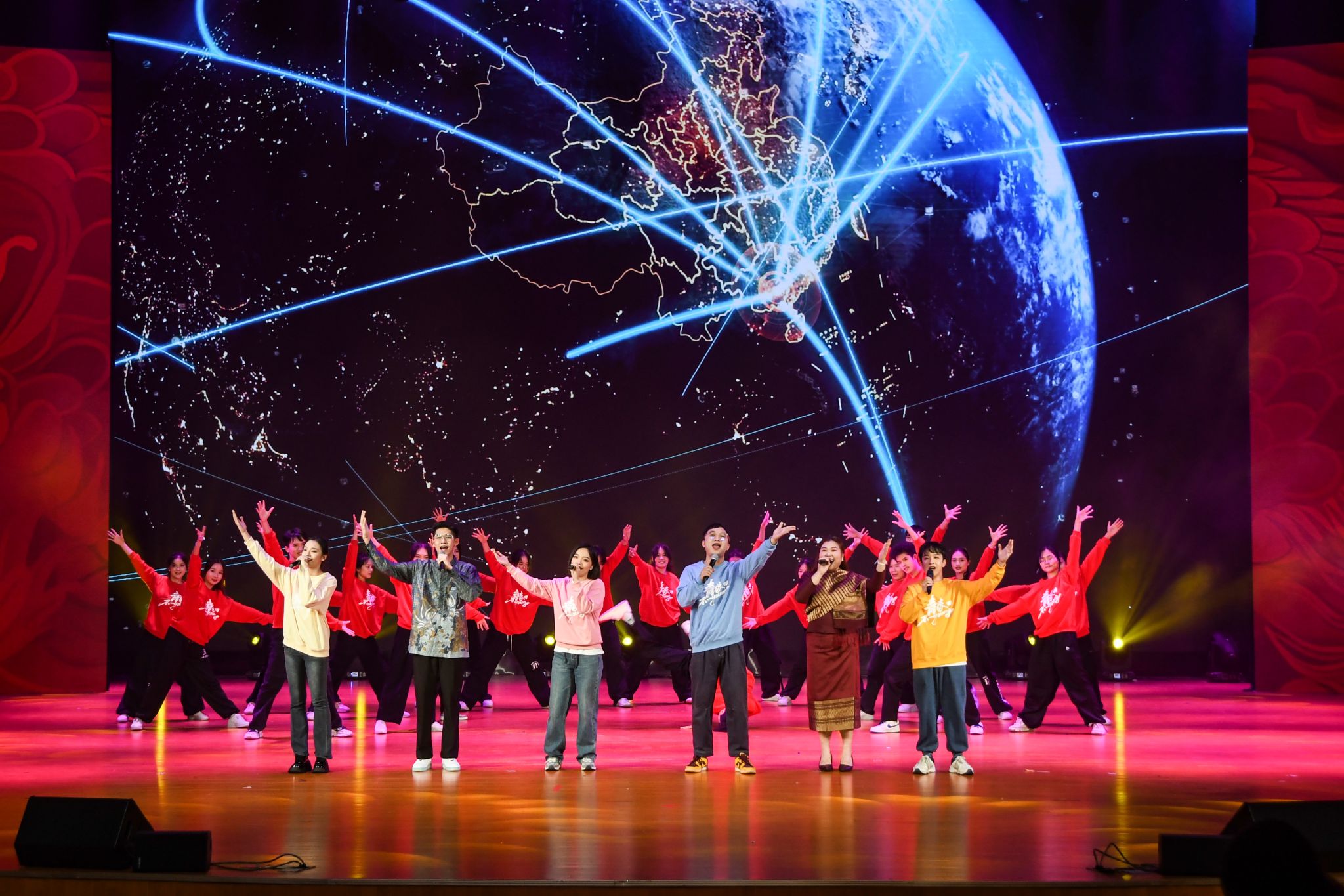 我校学青会开闭幕式师生代表带来的歌伴舞《青春遇见》拉开晚会序幕,展现出民大师生迎接新年热烈奔放、活力四射的精神面貌。晚会以“我们的歌”为主题,分为我们的根脉、我们的奋斗、我们的梦想三个乐章,为师生带来特色各异的16个节目。
