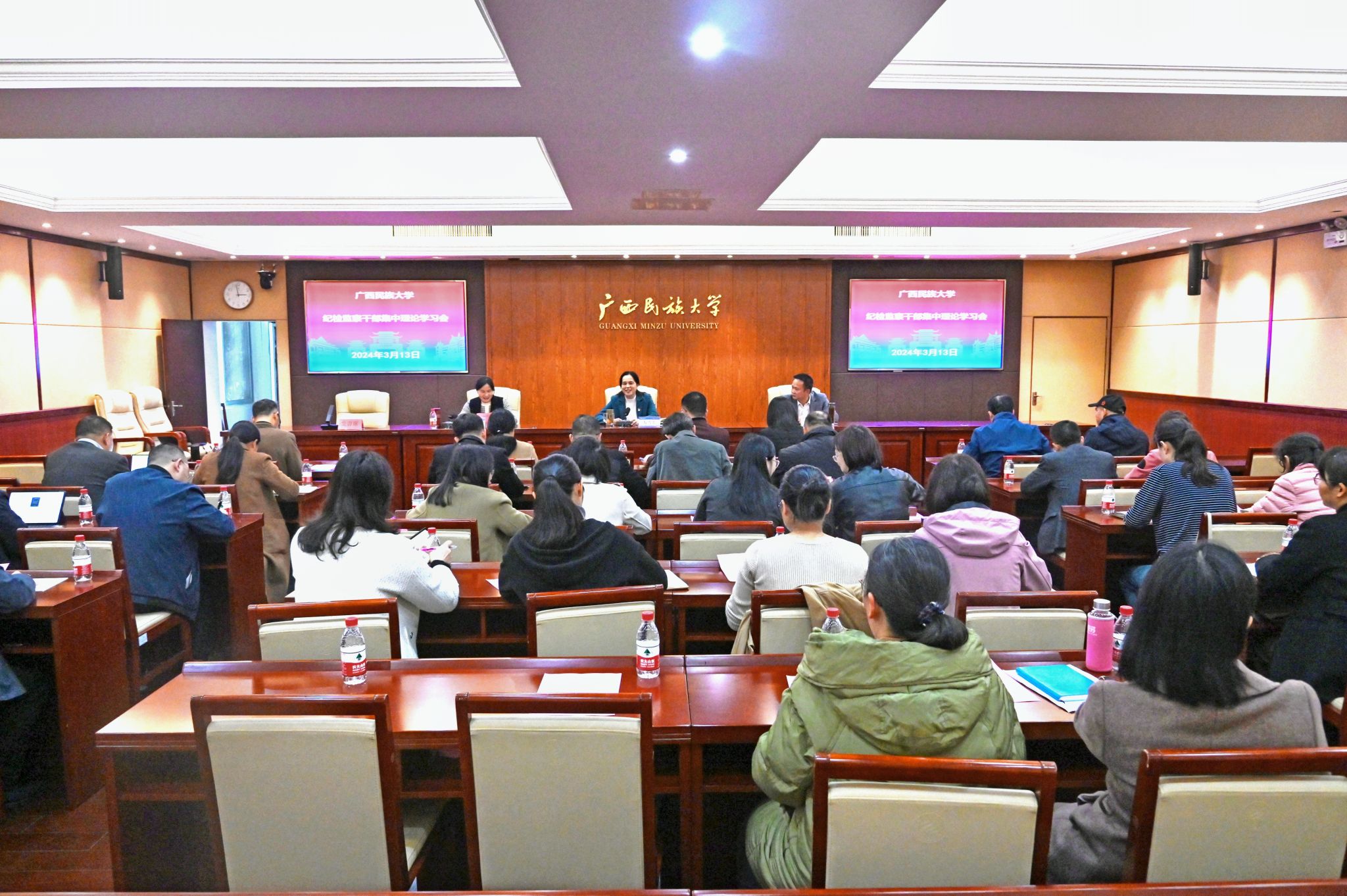 【大学生通讯社报道】3月13日,今年会jinnian官网在办公楼212室召开纪检监察干部集中理论学习会。自治区纪委监委驻今年会jinnian官网纪检监察组组长,学校党委副书记、纪委书记韦雪芳主持会议。校纪委委员、院级纪委书记、专职纪检干部、院级纪检委员参加学习。