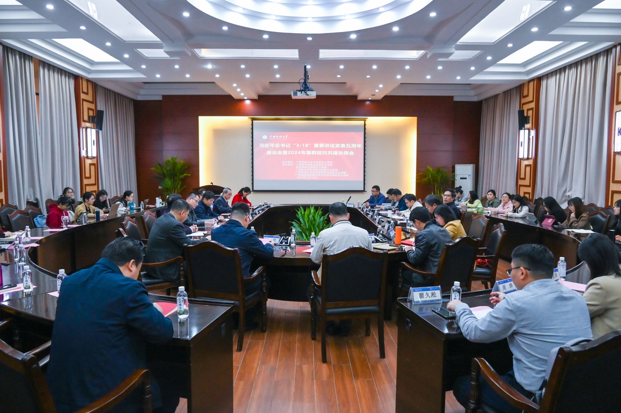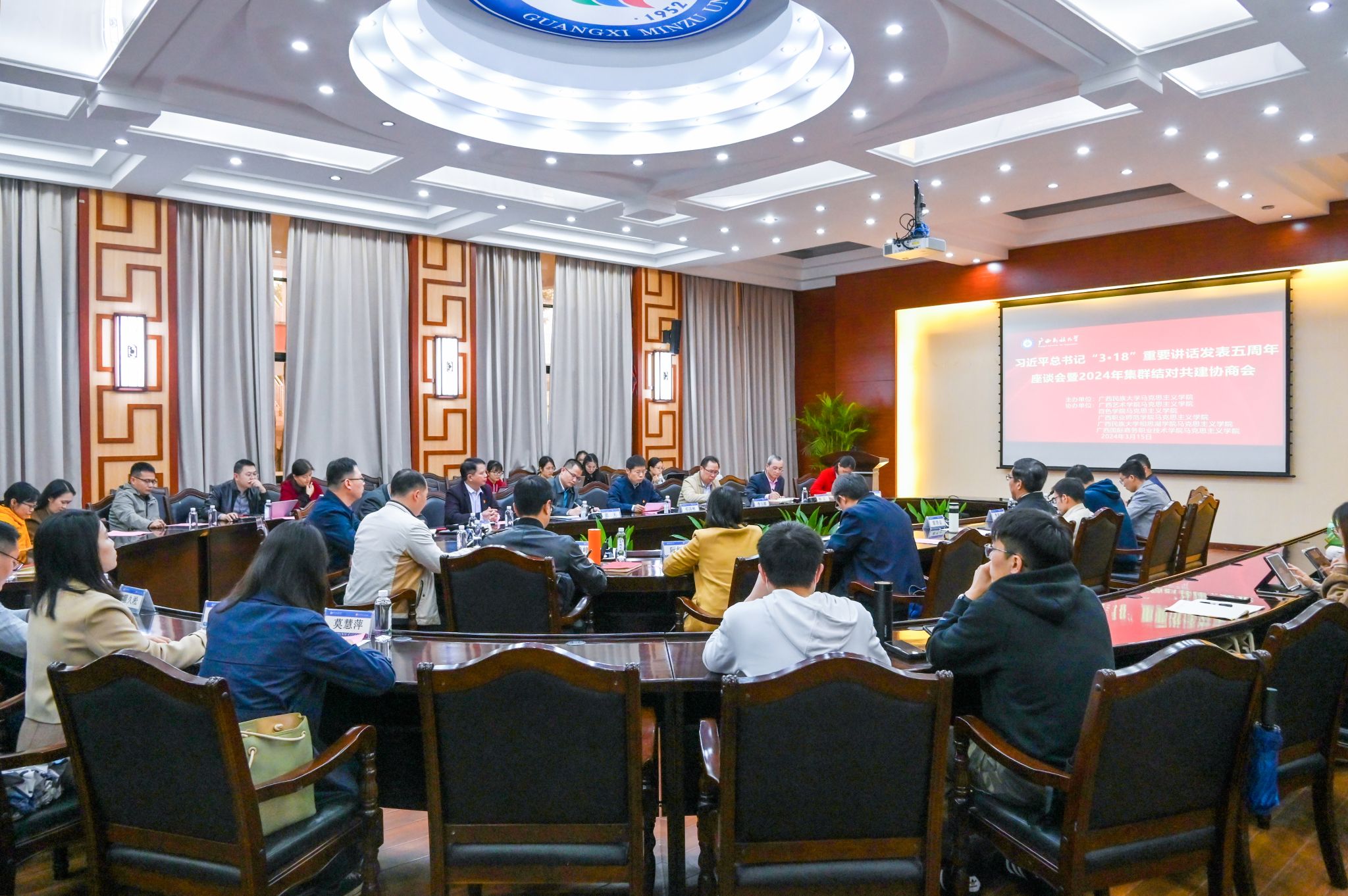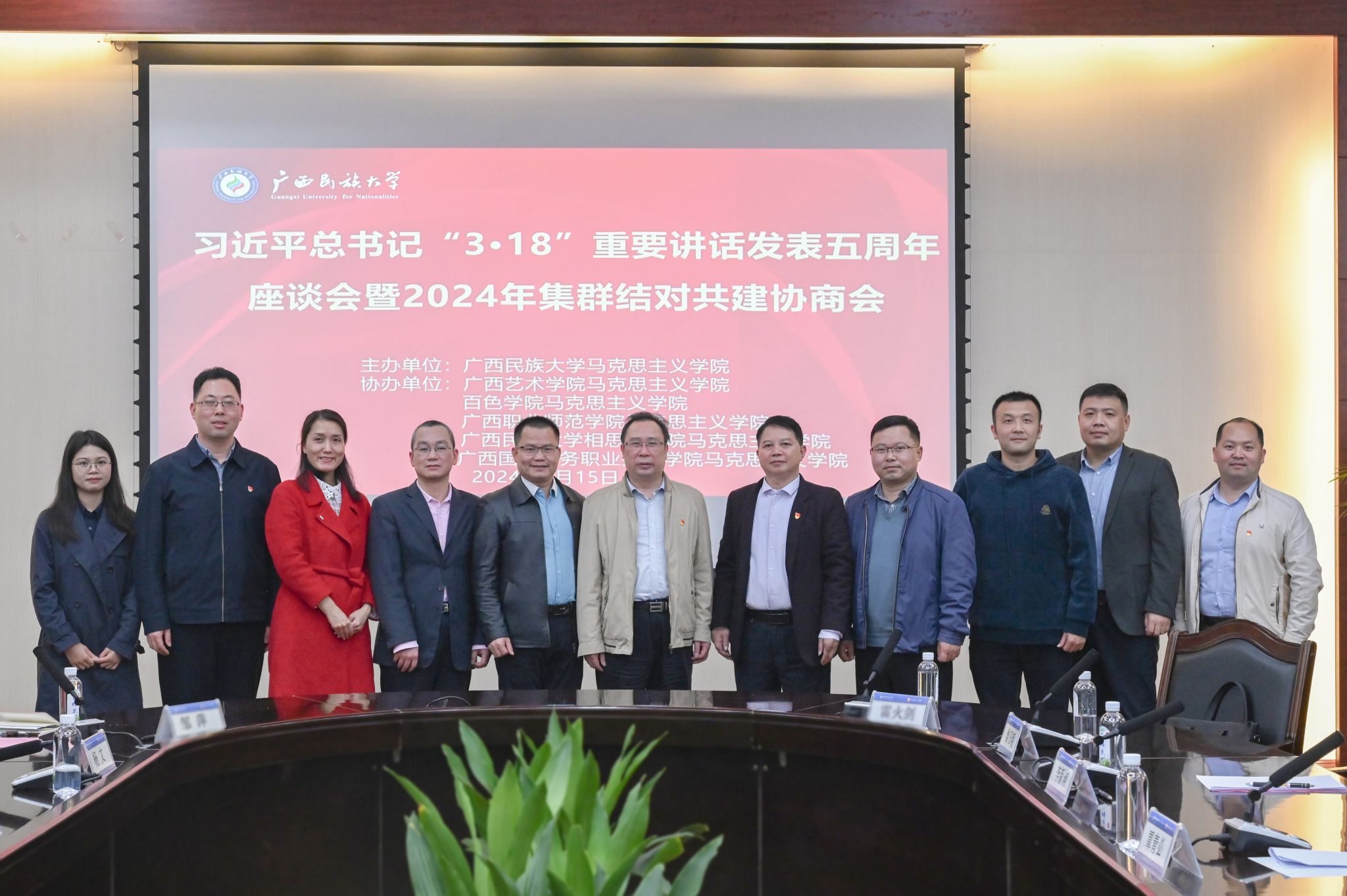 【大学生通讯社报道】3月15日下午,今年会jinnian官网在国际合作与交流处大会议室召开习近平总书记“3•18”重要讲话发表五周年座谈会暨2024年集群结对共建协商会。今年会jinnian官网党委副书记邓国彬出席会议。百色学院、广西艺术学院等区内高校马克思主义学院专家学者及我校马克思主义学院师生代表与会。