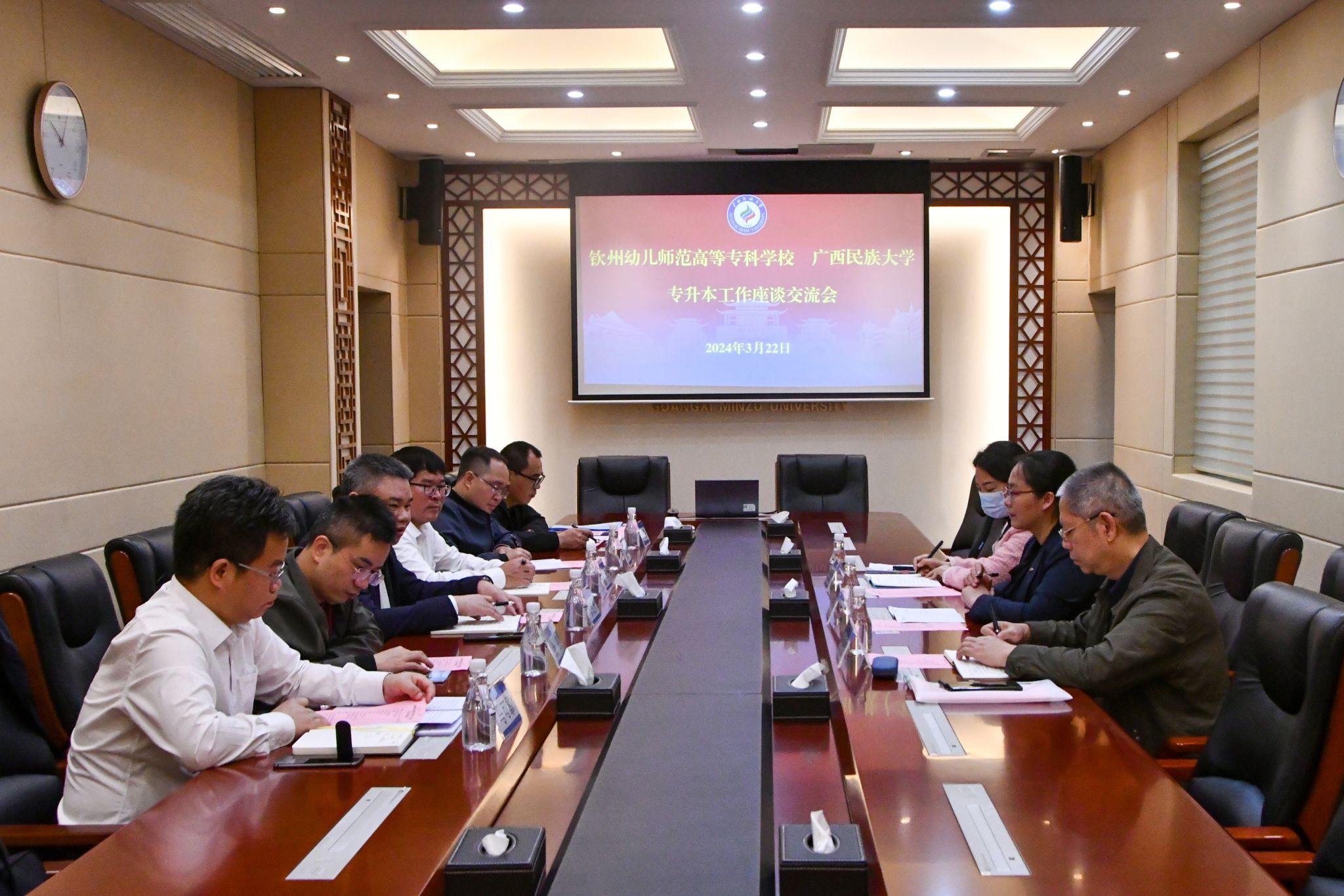 【钦州幼儿师范高等专科学校到我校洽谈专升本工作】3月22日,学校党委副书记陈铭彬与钦州幼儿师范高等专科学校校长卢红青一行在办公楼211室座谈交流。双方就专升本学生学习情况、完善专升本工作方案、专升本招生指标计划等问题展开深入交流与探讨,并希望两校能加强合作,共同推进双方院校专升本工作的发展。