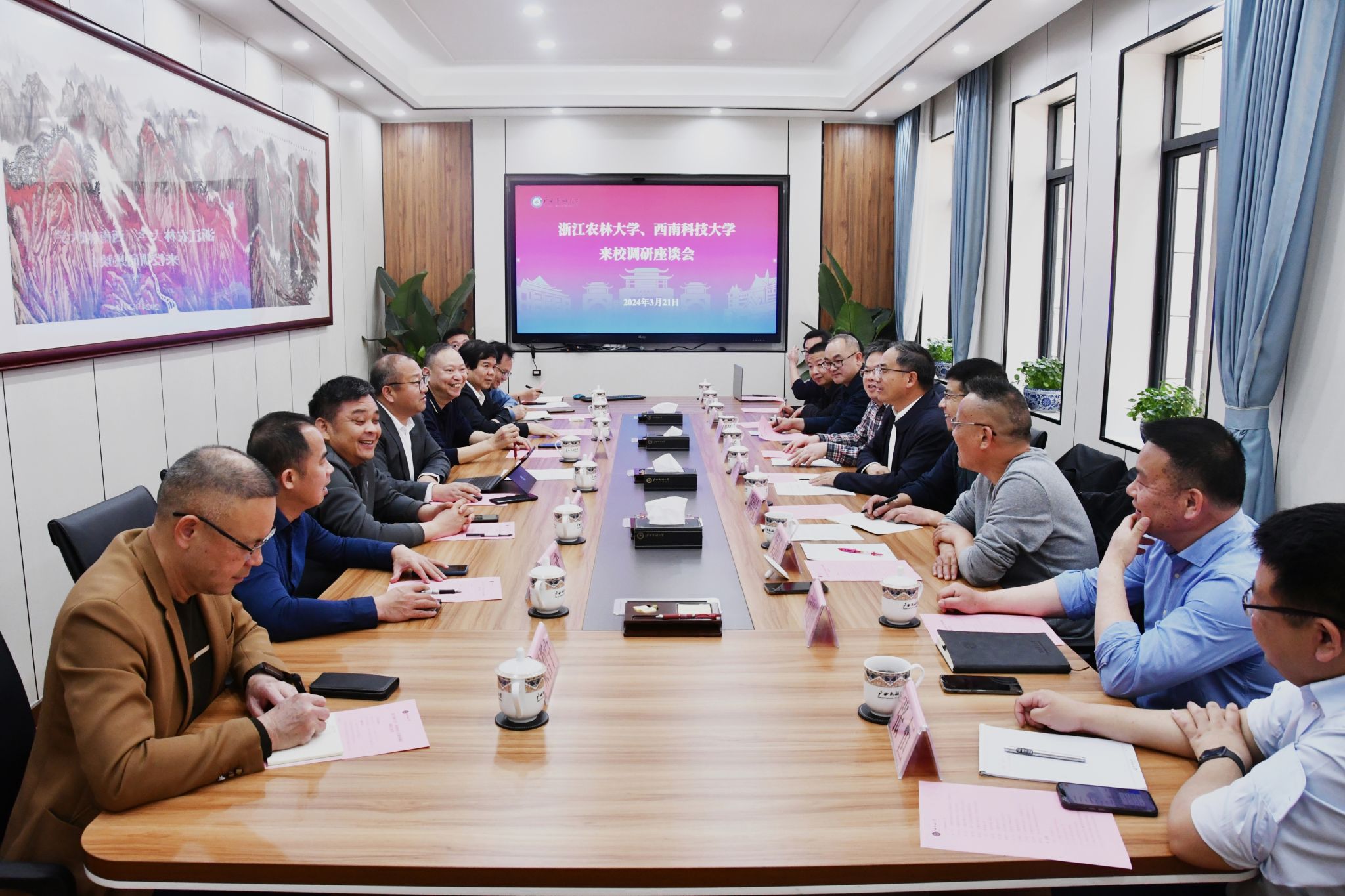 【浙江农林大学、西南科技大学到今年会jinnian官网调研】3月21日,副校长姜明国与浙江农林大学副校长胡祖吉,西南科技大学后勤服务集团总公司党委副书记、纪委书记袁明座谈交流。姜明国介绍我校“绿色学校”创建的具体做法、房产资源精细化管理和有偿使用办法、校园食品安全排查整治专项行动措施和长效化机制建设、校友会工作创新举措、后勤保障工作创新及后勤劳动教育开展情况。