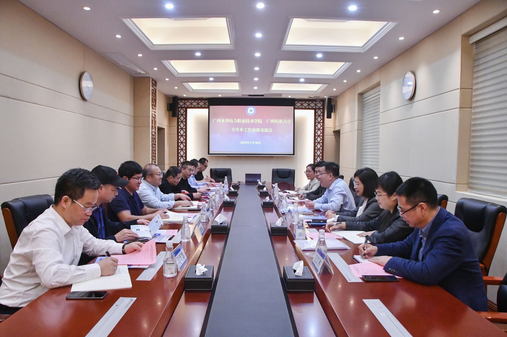 【广西水利电力职业技术学院到我校交流】3月18日,副校长姜明国与广西水利电力职业技术学院校长李林一行座谈交流。姜明国表示,学校应顺应国家职业发展方向,坚持服务地方经济发展,进一步提高学生职业技能素质教育,培养学生的职业精神和奋斗精神;院校之间要相互输送人才,加强产教联盟、产教融合,打通专升本、专升硕、专升博的细链条,构建专升本、中外合作办学关系网。