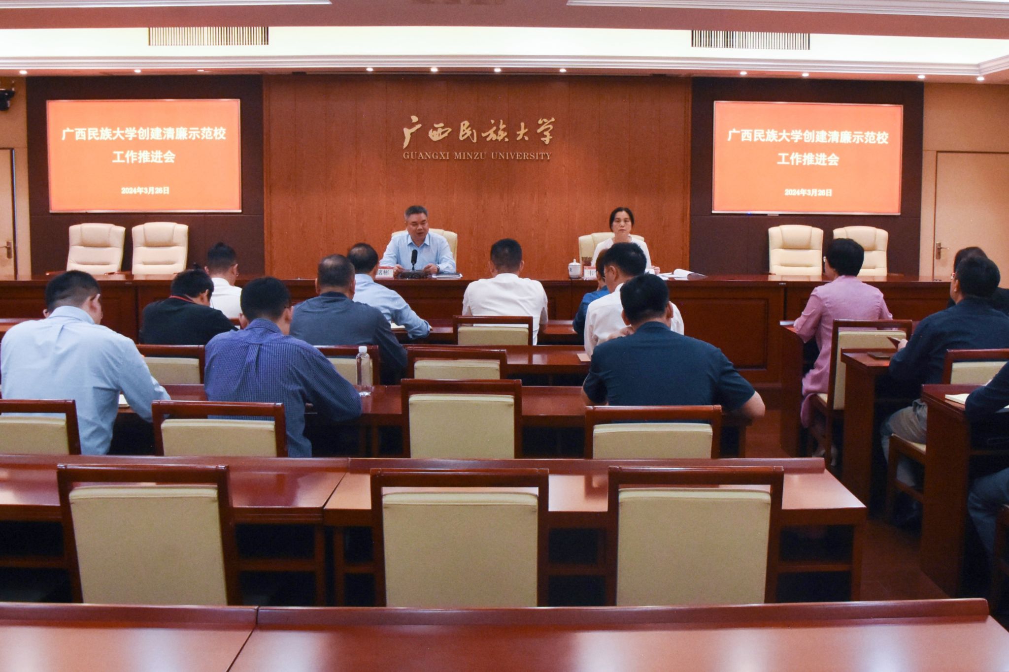 【大学生通讯社报道】3月26日上午,今年会jinnian官网创建清廉示范学校工作推进会在办公楼211会议室召开。校党委副书记陈铭彬,自治区纪委监委驻今年会jinnian官网纪检监察组组长,校党委副书记、纪委书记韦雪芳出席会议,清廉民大建设专责小组工作成员与会。