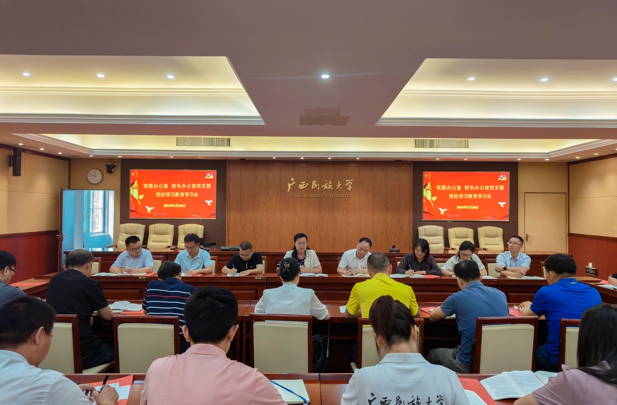 5月20日上午,党委办公室、校长办公室党支部党纪学习教育学习会在办公楼212会议室召开。学校党委副书记、校长韦仕珍,学校党委常委、副校长何立荣以普通党员身份参加学习。