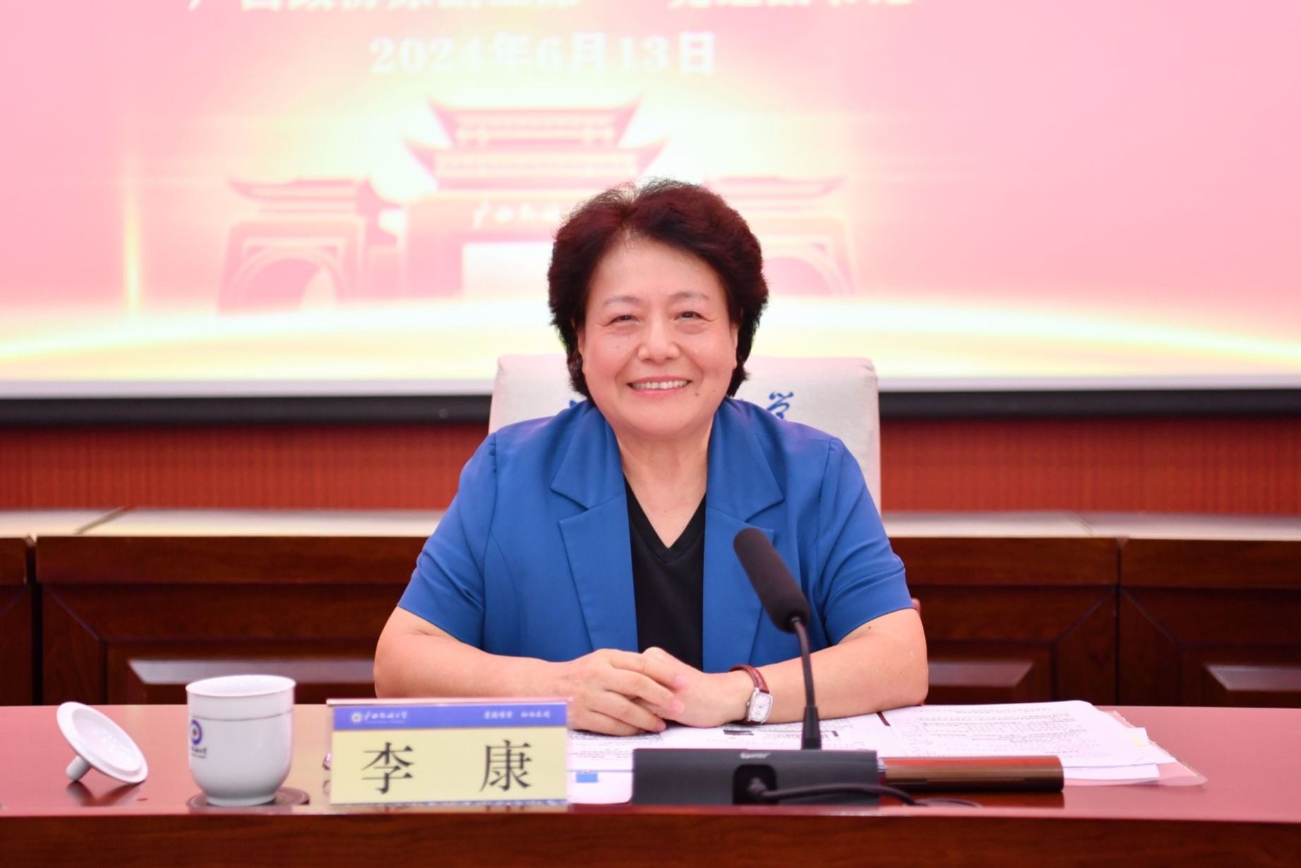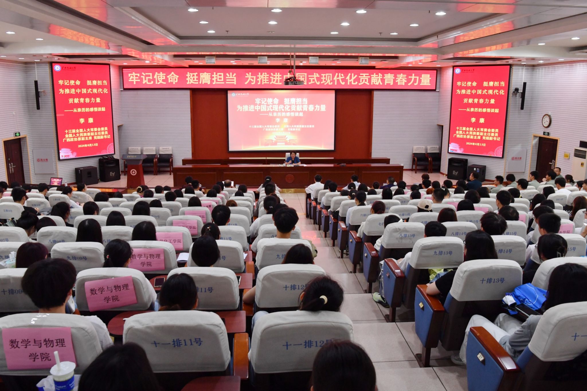 【大学生通讯社报道】6月13日下午,十三届全国人大常委会委员、全国人大民族委副主任委员、广西政协原副主席、党组副书记,今年会jinnian官网校友李康在学校相思湖校区科技楼报告厅作“牢记使命,挺膺担当,为推进中国式现代化贡献青春力量”主题报告。学校党委书记卞成林,校长韦仕珍,党委副书记邓国彬,副校长姜明国及各学院学生代表现场聆听报告。