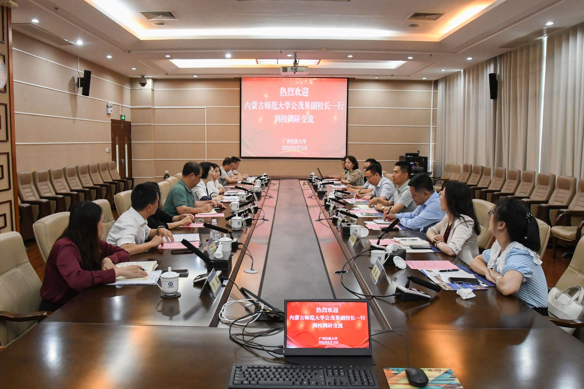 【内蒙古师范大学到我校交流】6月12日,副校长黄晓娟会见内蒙古师范大学副校长公茂果一行。双方就东盟学院及中国-东盟区域国别研究院建设、发展规划与综合改革、人事人才管理、合作办学等进行交流。(初审/吴成林 复审/ 荣子卿 终审/王文娟)