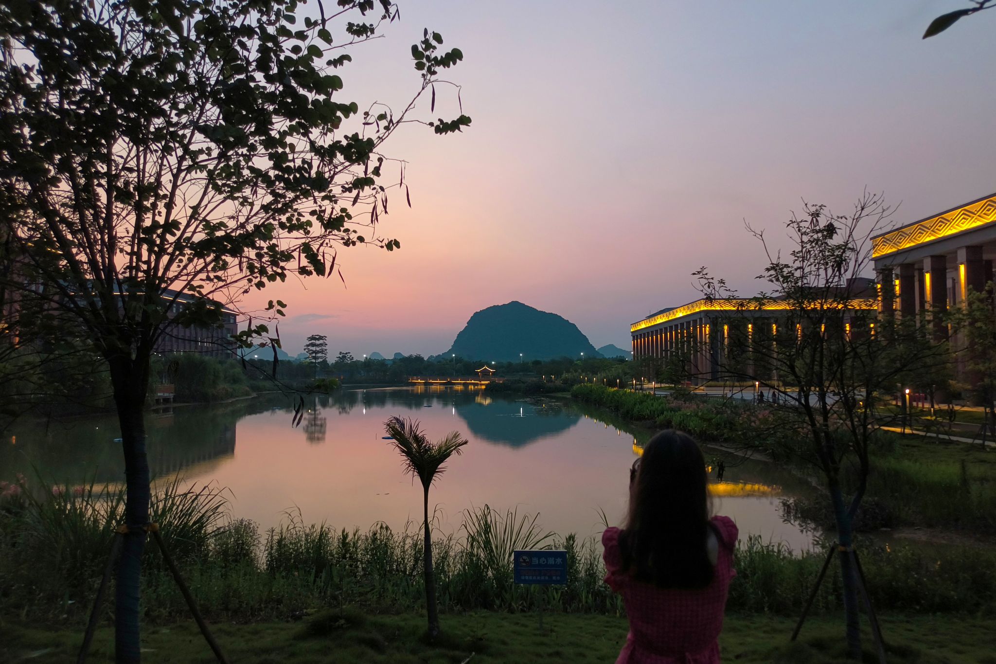 夜幕降临,月色温柔,灯光洒在宁静的湖面上,照亮亭下的梦。夏至的民大,是光影的盛宴,是青春的舞台。