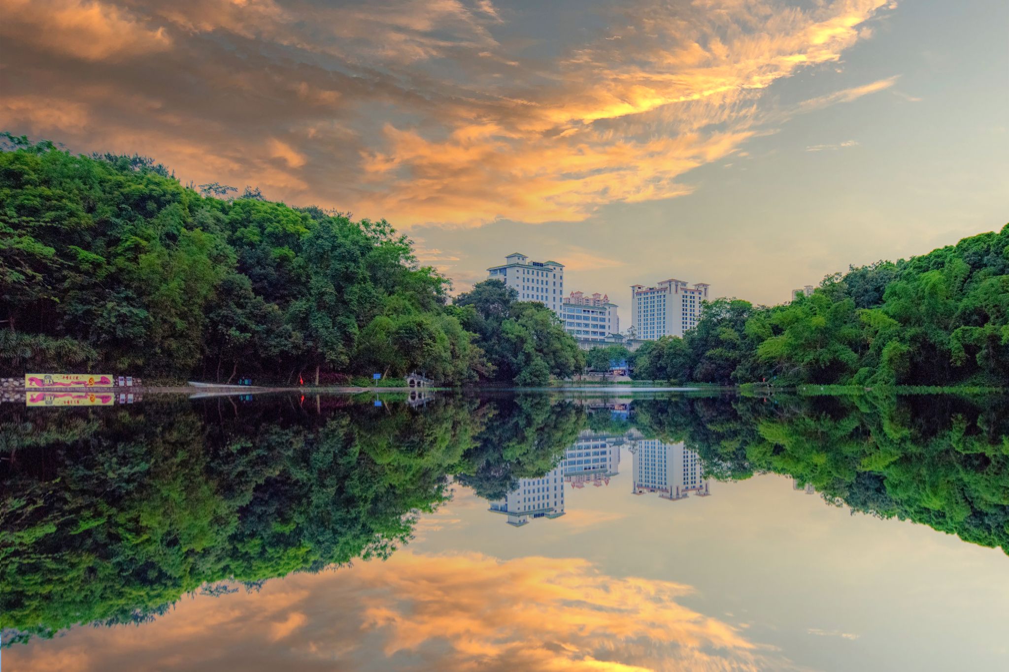 湖面波光粼粼,与远处的蓝天相映成趣,绿茵场肆意挥洒汗水的少年,阳光透过树叶撒下的光影,在水波中轻点的飞鸟,缓缓从天空落下的骄阳,构成了一幅动人的画卷。