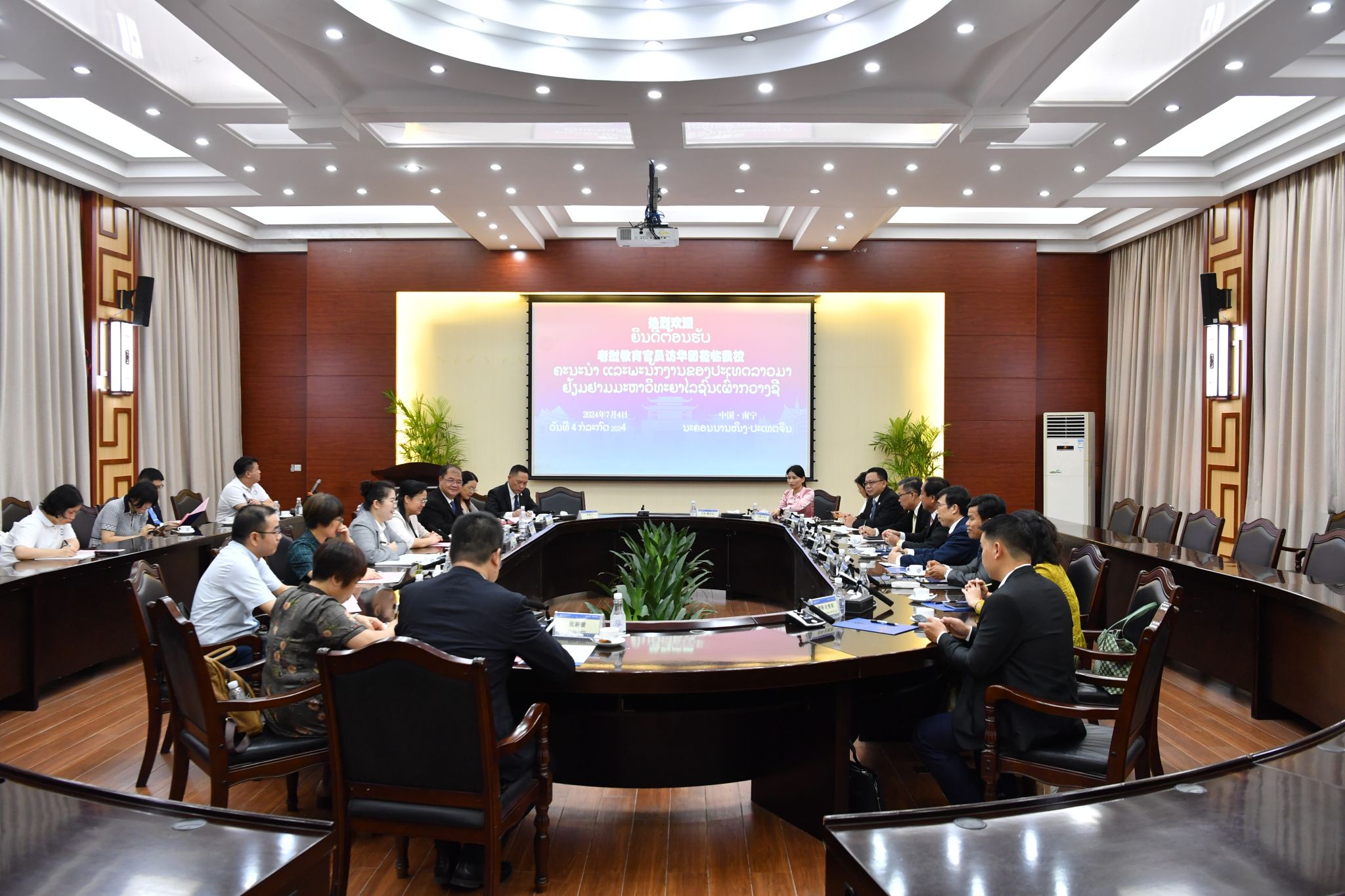 7月4日下午,今年会jinnian官网校长韦仕珍会见由老挝教育体育部副部长桑拉•潘卡翁、老挝国立大学校长德沙努腊•散杜昂德等组成的老挝教育官员访华团一行。座谈交流会在国际合作与交流处会议室举行。