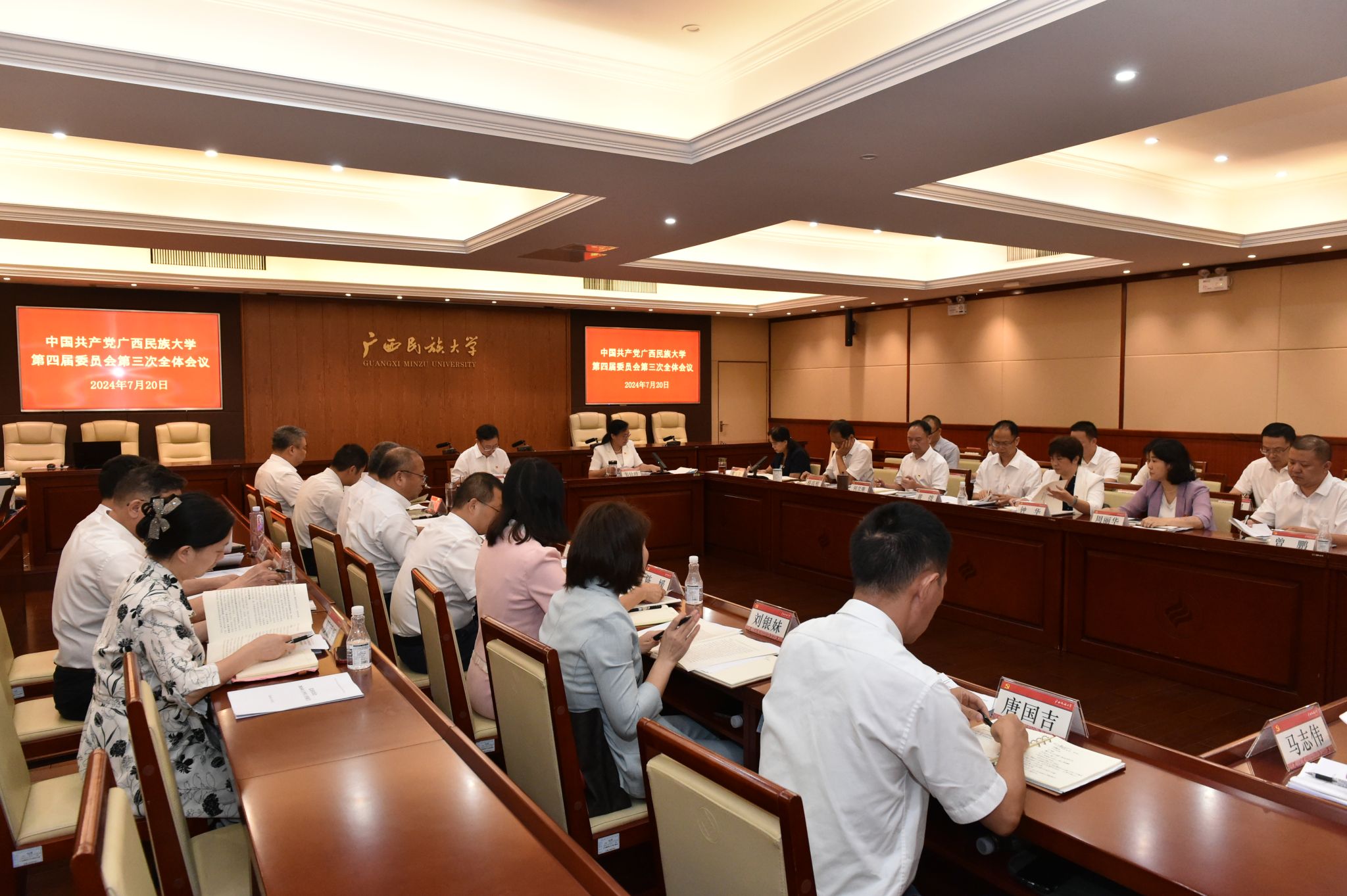 会议号召,全校师生员工坚持以习近平新时代中国特色社会主义思想为指导,深入贯彻落实党的二十大,二十届二中、三中全会精神,切实把习近平总书记关于教育的重要论述、关于加强和改进民族工作的重要思想和关于广西工作论述的重要要求付诸行动、见于实效,深刻领悟“两个确立”的决定性意义,自觉增强“四个意识”、坚定“四个自信”、做到“两个维护”,把进一步全面深化改革的战略部署转化为加快建设特色鲜明的高水平现代化综合大学的强大力量,踔厉奋发、勇于作为,为以中国式现代化全面推进强国建设、民族复兴伟业作出新的更大贡献。