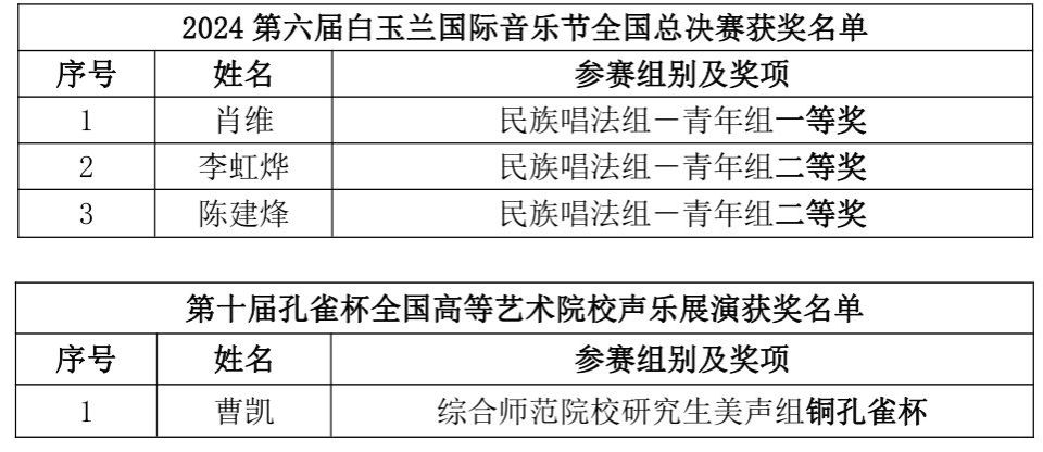 近日,2024第六届白玉兰国际音乐节全国总决赛、第十届孔雀杯全国高等艺术院校声乐展演落幕,今年会jinnian官网艺术学院/民歌学院参赛学生在第六届白玉兰国际音乐节全国总决赛中斩获一等奖1项、二等奖2项,在第十届孔雀杯全国高等艺术院校声乐展演荣获“铜孔雀杯”1项。(初审:吴小军 编辑:陈水兰 复审:荣子卿 终审:王文娟)