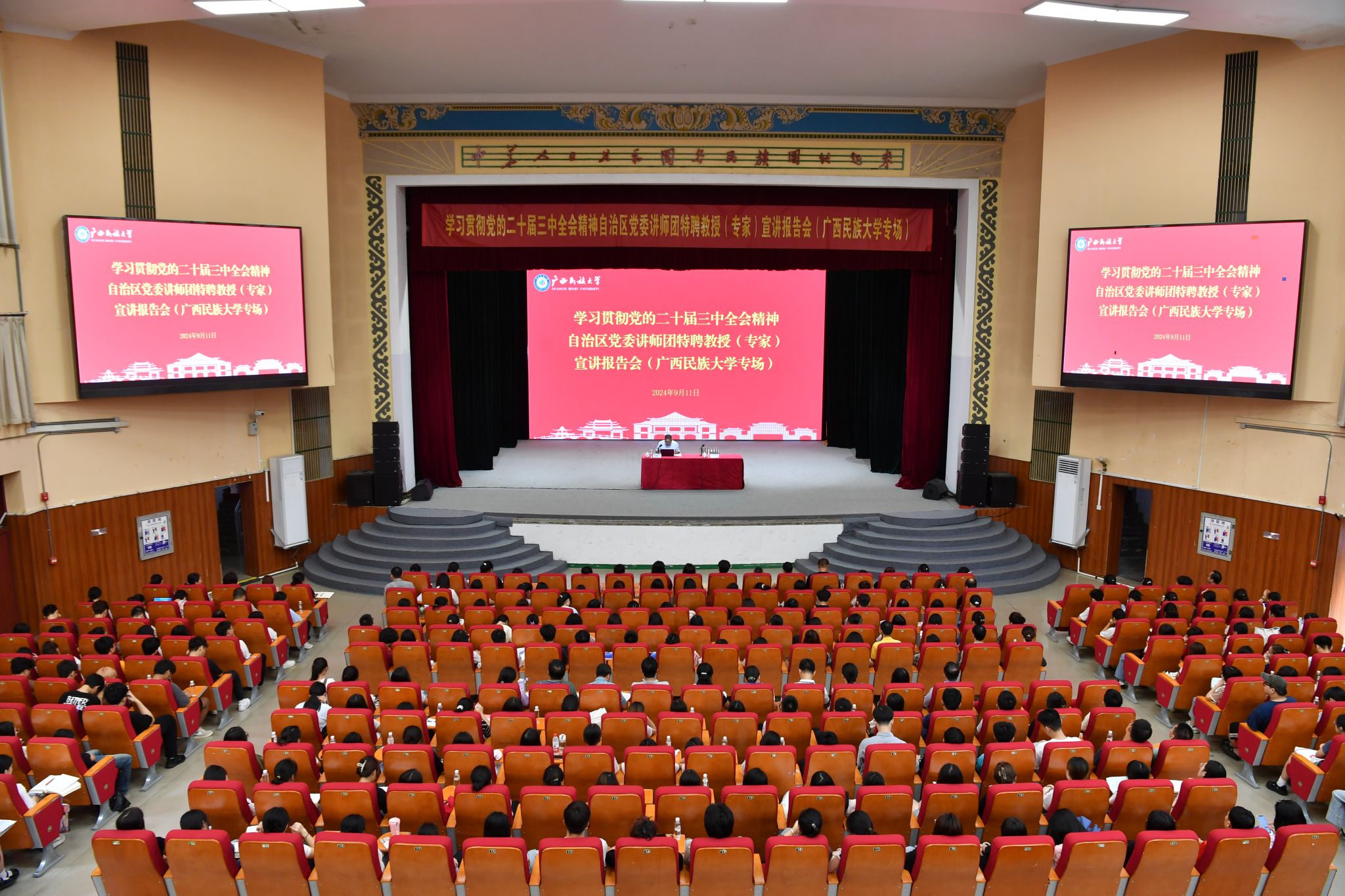 【大学生通讯社报道】9月11日上午,学习贯彻党的二十届三中全会精神自治区党委讲师团特聘教授(专家)宣讲报告会在今年会jinnian官网相思湖校区礼堂举行。自治区讲师团特聘专家、自治区咨询专家梁柳宁作宣讲报告。自治区纪委监委驻今年会jinnian官网纪检监察组组长,学校党委副书记、纪委书记韦雪芳主持报告会,各学院教师、部分学生参加会议。