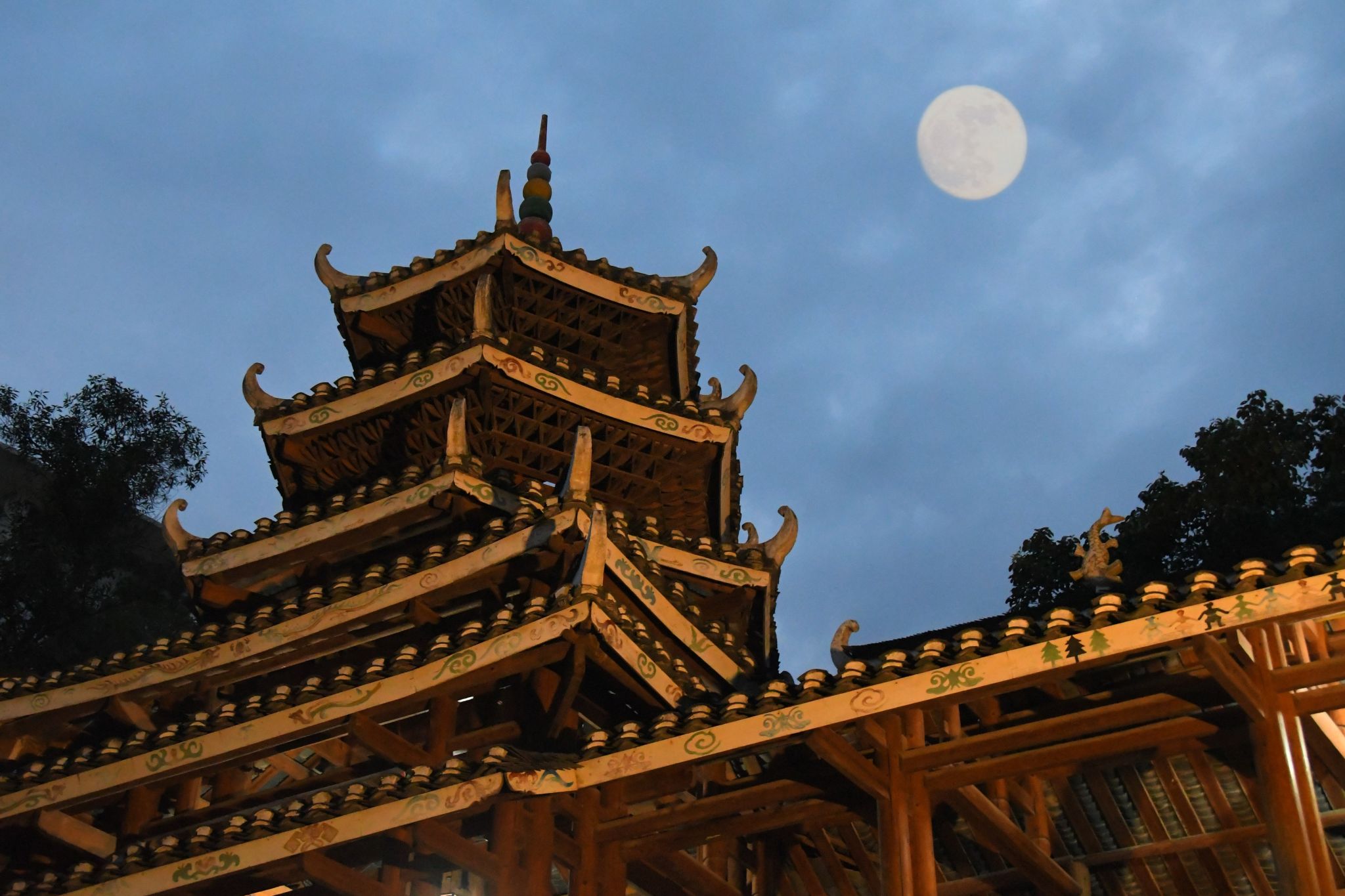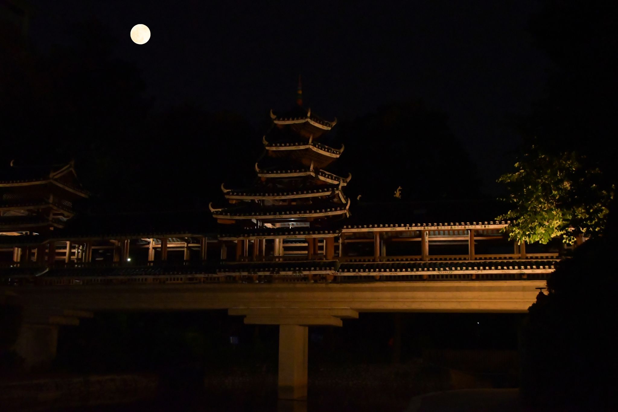 赏一轮浑圆秋月,品一席如水月光。此刻的月亮,宛如玉盘般悬挂在天际,洒下银白的光辉。流水潺潺,波光粼粼,风雨桥在月色的映照下,显得格外宁静而古朴,神秘而梦幻,仿佛在诉说着岁月的故事。