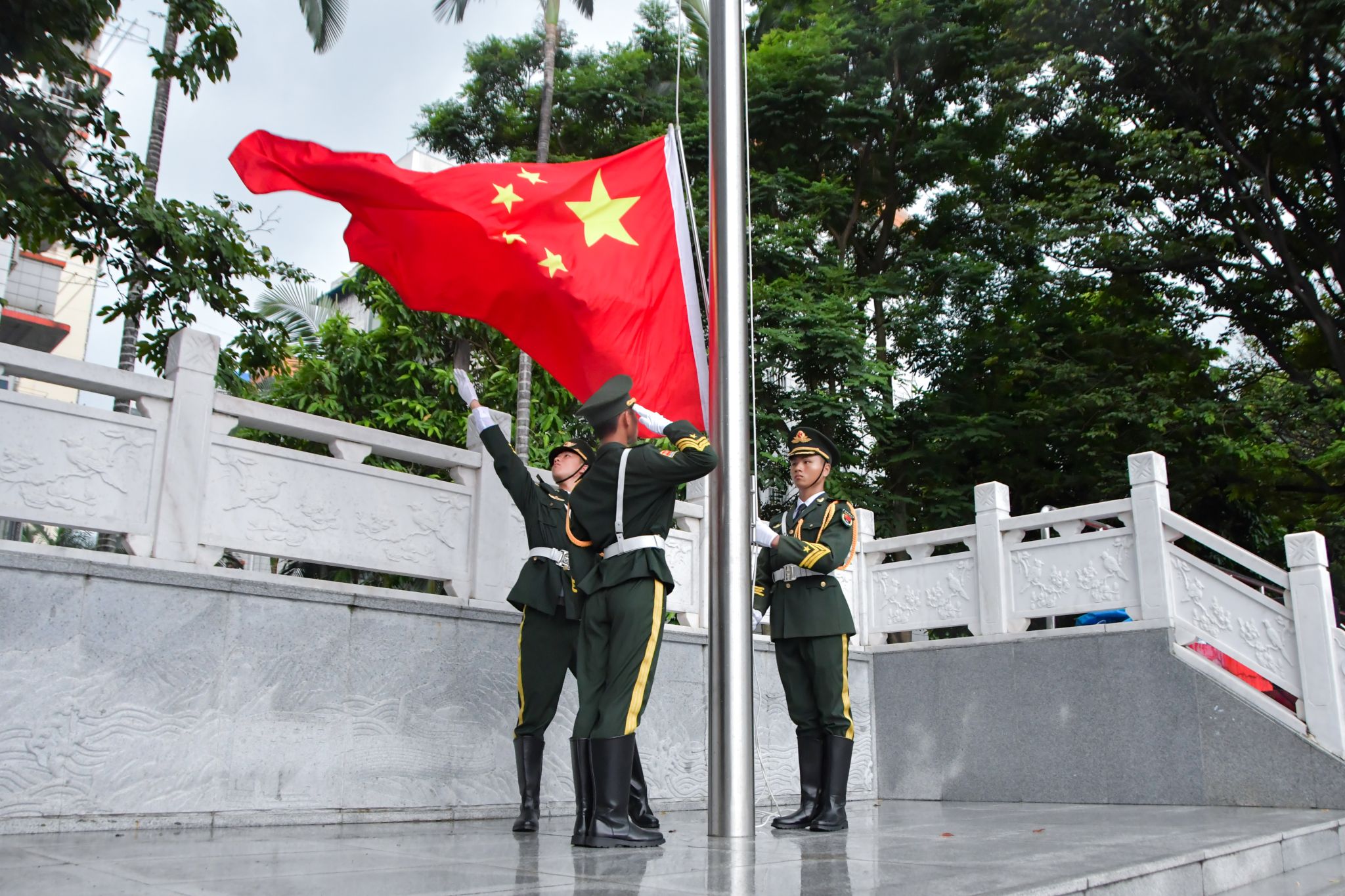 上午8时,庄严肃穆的升旗仪式拉开序幕。护旗队员们英姿飒爽,以挺拔的身姿、整齐划一的队形步入升旗台前。擎旗手手持国旗,随着雄壮激越的国歌声,鲜艳夺目的五星红旗缓缓升起。