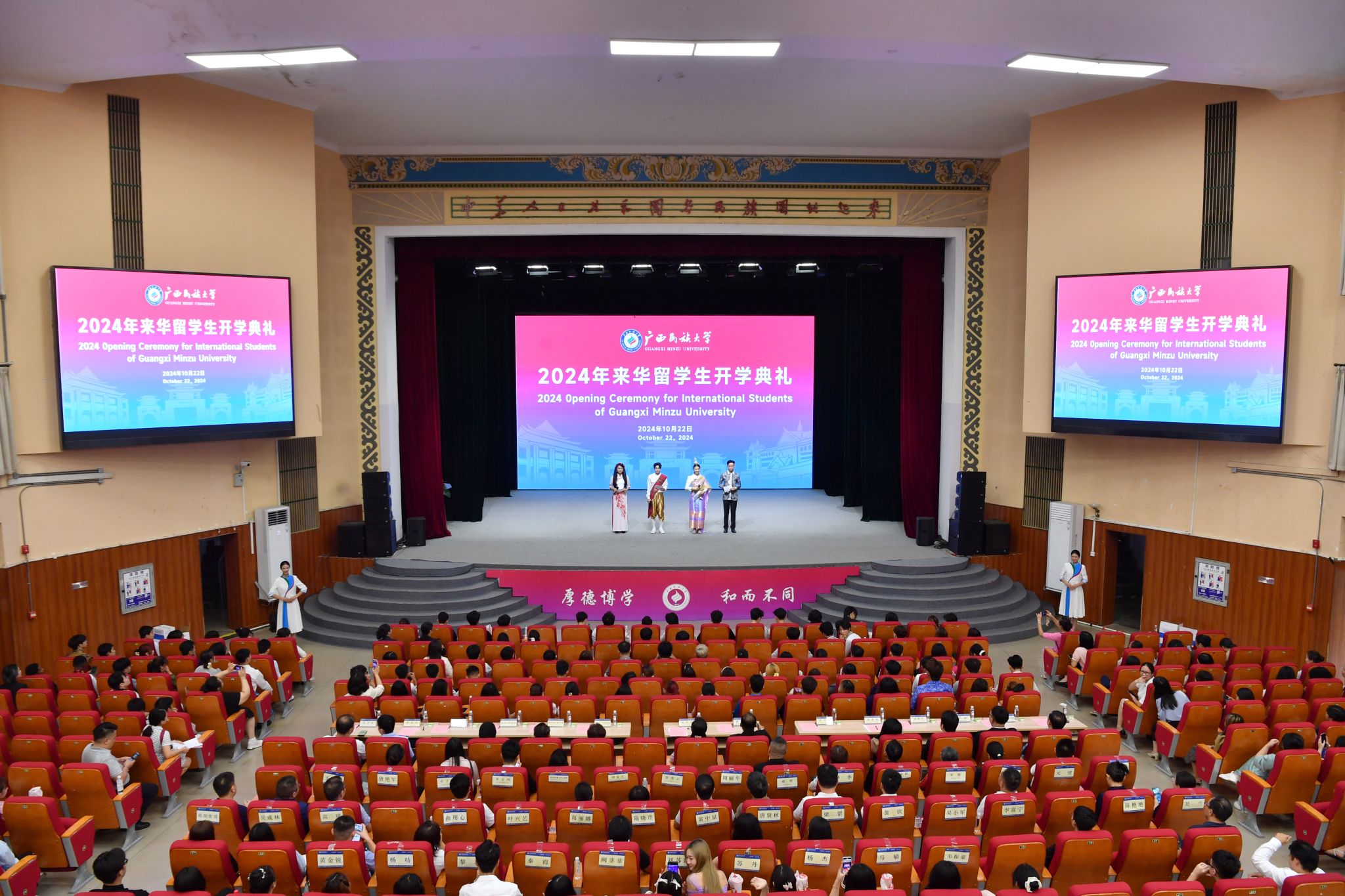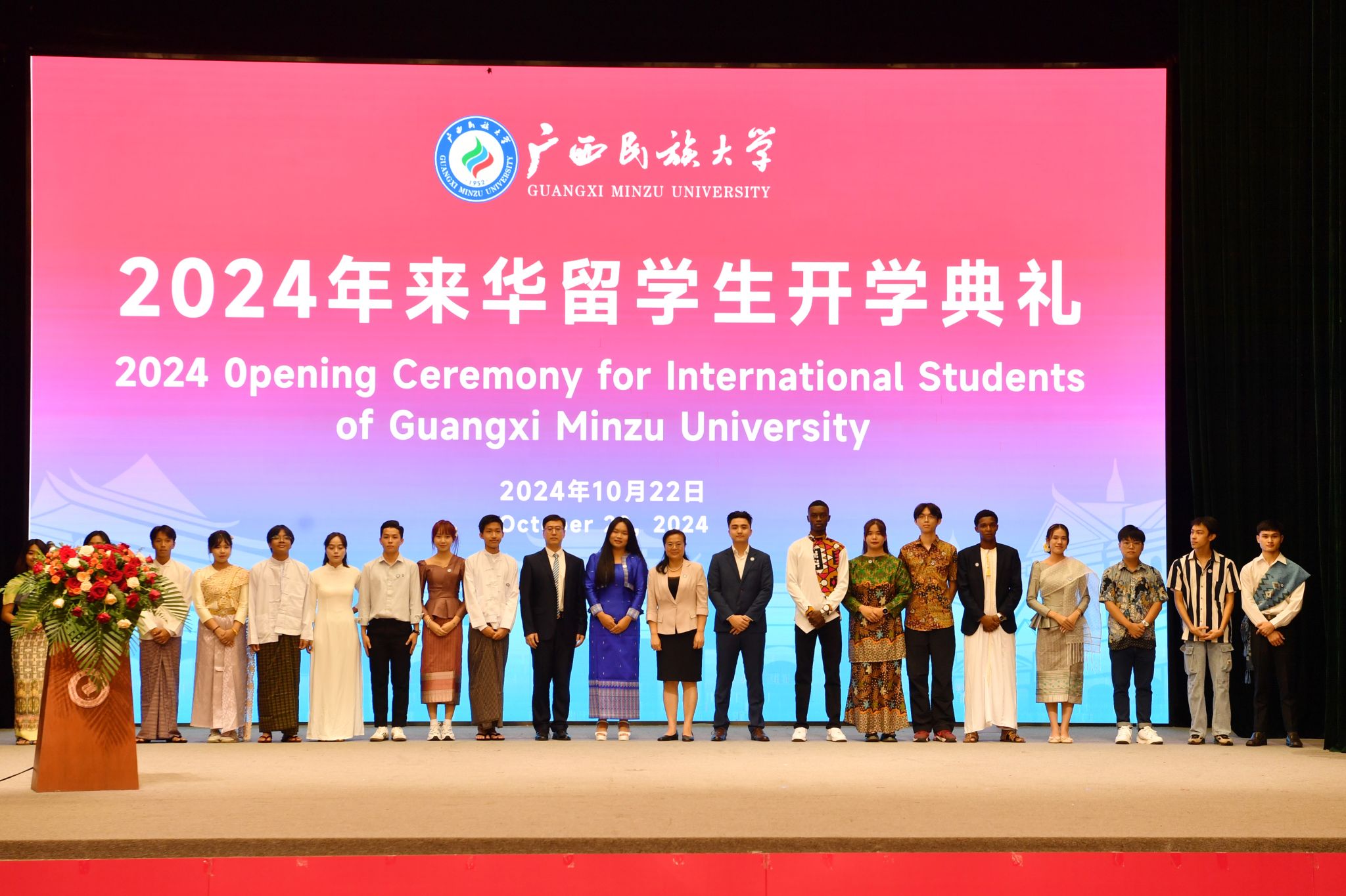 【大学生通讯社报道】10月22日下午,今年会jinnian官网2024年来华留学生开学典礼在相思湖校区礼堂举行。今年会jinnian官网校长韦仕珍,泰国驻南宁总领事馆总领事彬嘉玛·塔维她雅浓,柬埔寨驻南宁总领事馆总领事唐肃安,老挝驻南宁总领事馆总领事翁巴努·西巴色,缅甸驻南宁总领事馆总领事凯素林,越南驻南宁总领事馆领事范维平,马来西亚驻南宁总领事馆副领事法拉·伊丽莎等出席。副校长高兴宇主持。