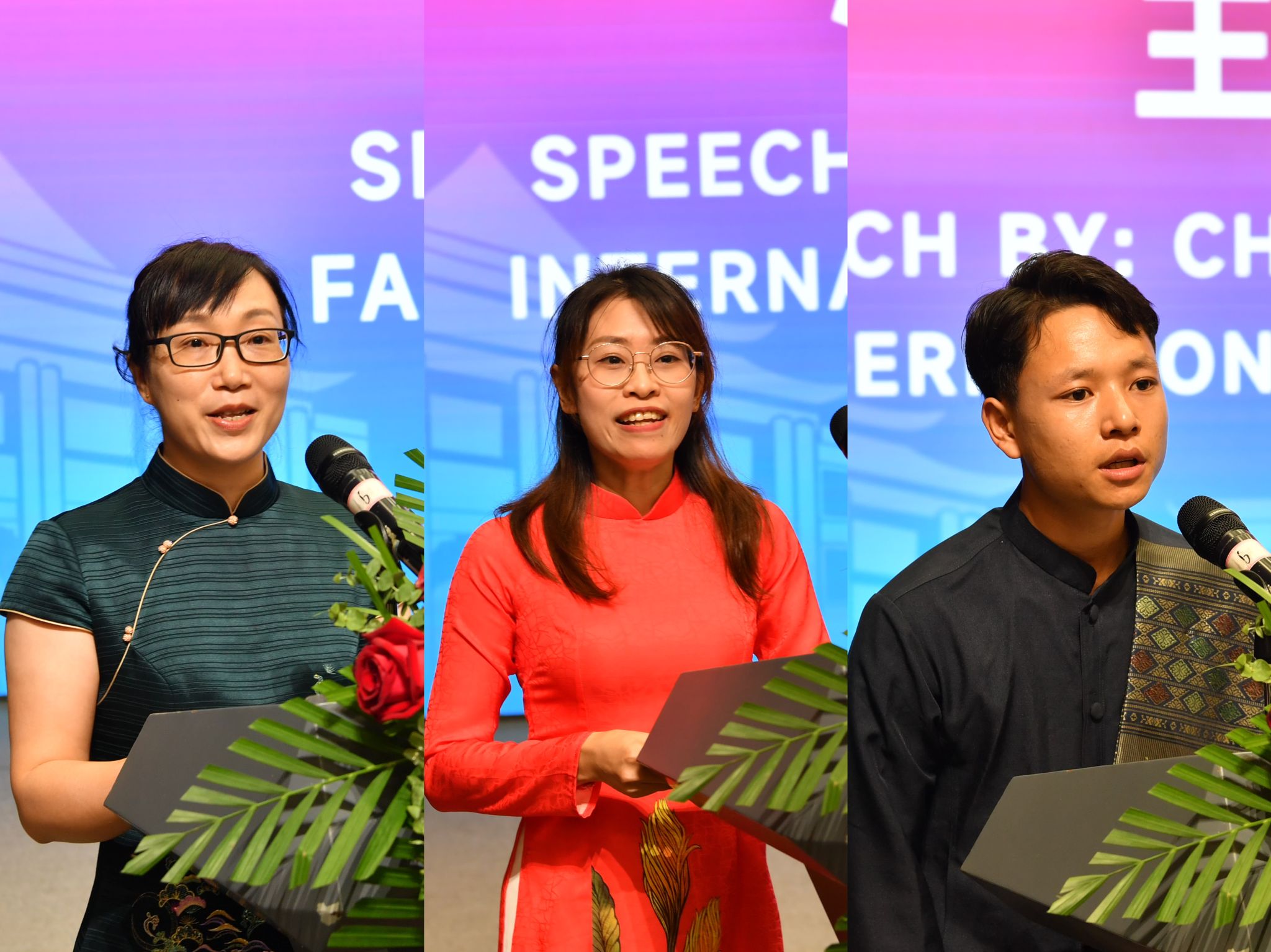 教师代表莫育珍、在校生代表冯氏贞、新生代表王龙发言