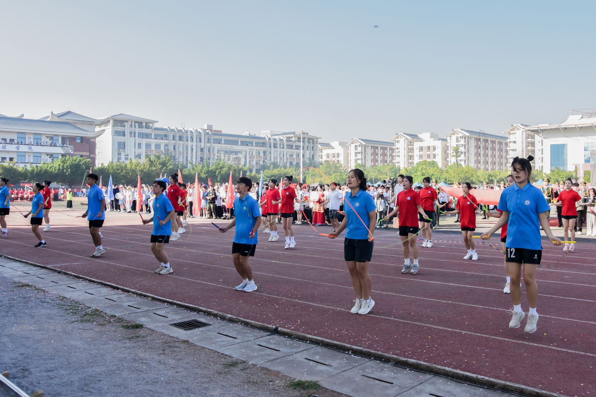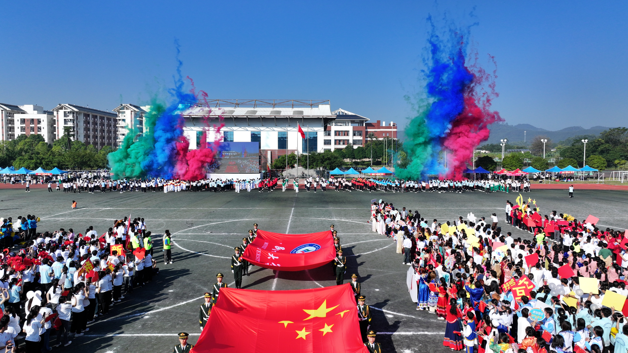 伴随着激昂的《运动员进行曲》,国旗方队、校旗方队、礼宾枪方块队、裁判员代表队、不同民族同学组成的红石榴方块队、各学院代表队意气风发依次入场,嘹亮的口号、精彩的表演传递出民大师生的青春风采,花样篮球、跳绳方队的花式表演为入场式更添活力。