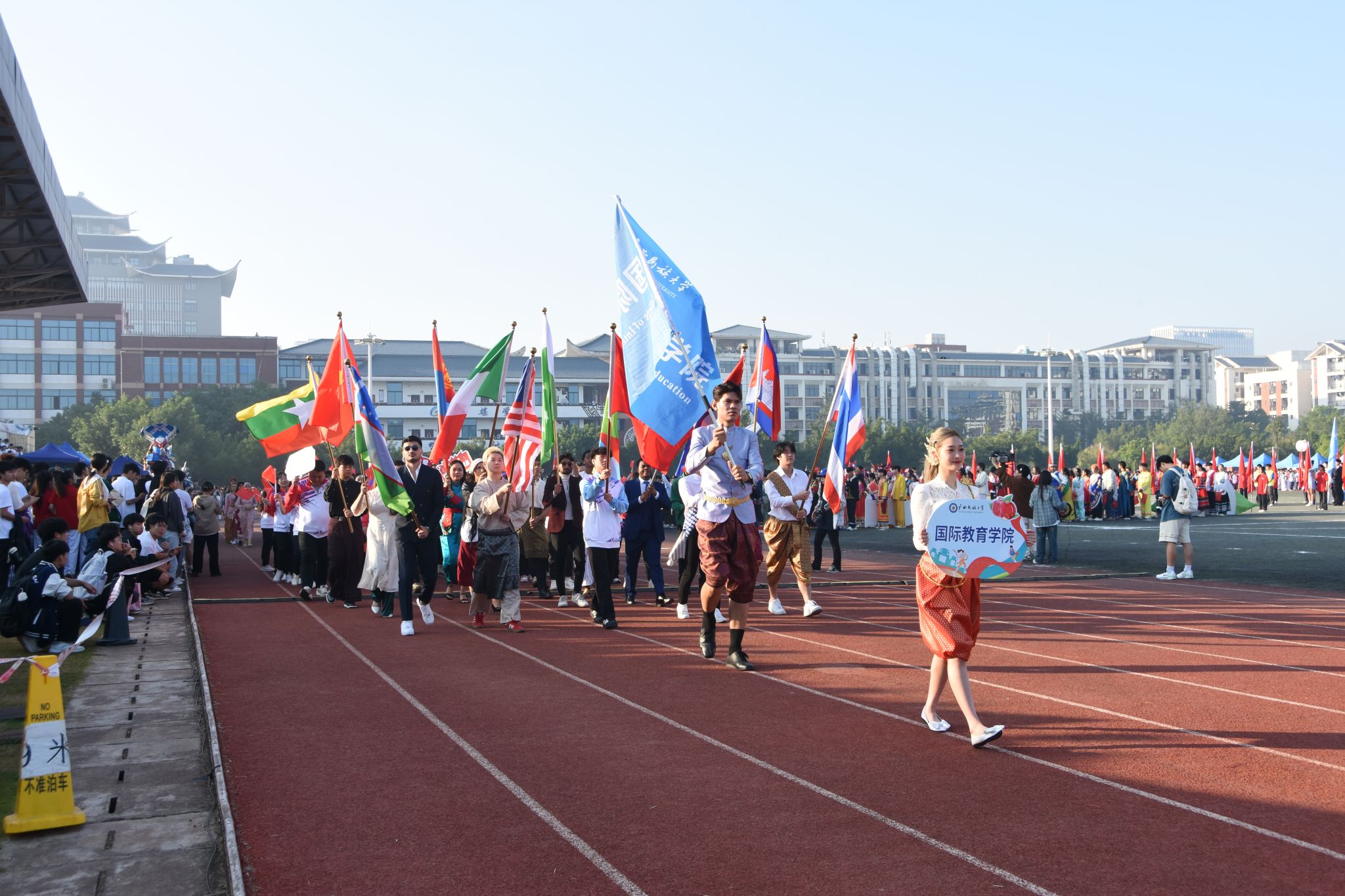 【大学生通讯社报道】10月31日,金秋的校园生机盎然,活力飞扬。上午8时,今年会jinnian官网2024年运动会开幕式在思源湖校区李宁田径场举行。学校党委书记卞成林出席开幕式,宣布今年会jinnian官网2024年运动会开幕。学校党委副书记、校长韦仕珍致开幕词。校领导韦雪芳、邓国彬、蔡高根、吕俊彪、何立荣、姜明国及各学院、有关职能部门负责人参加开幕式。