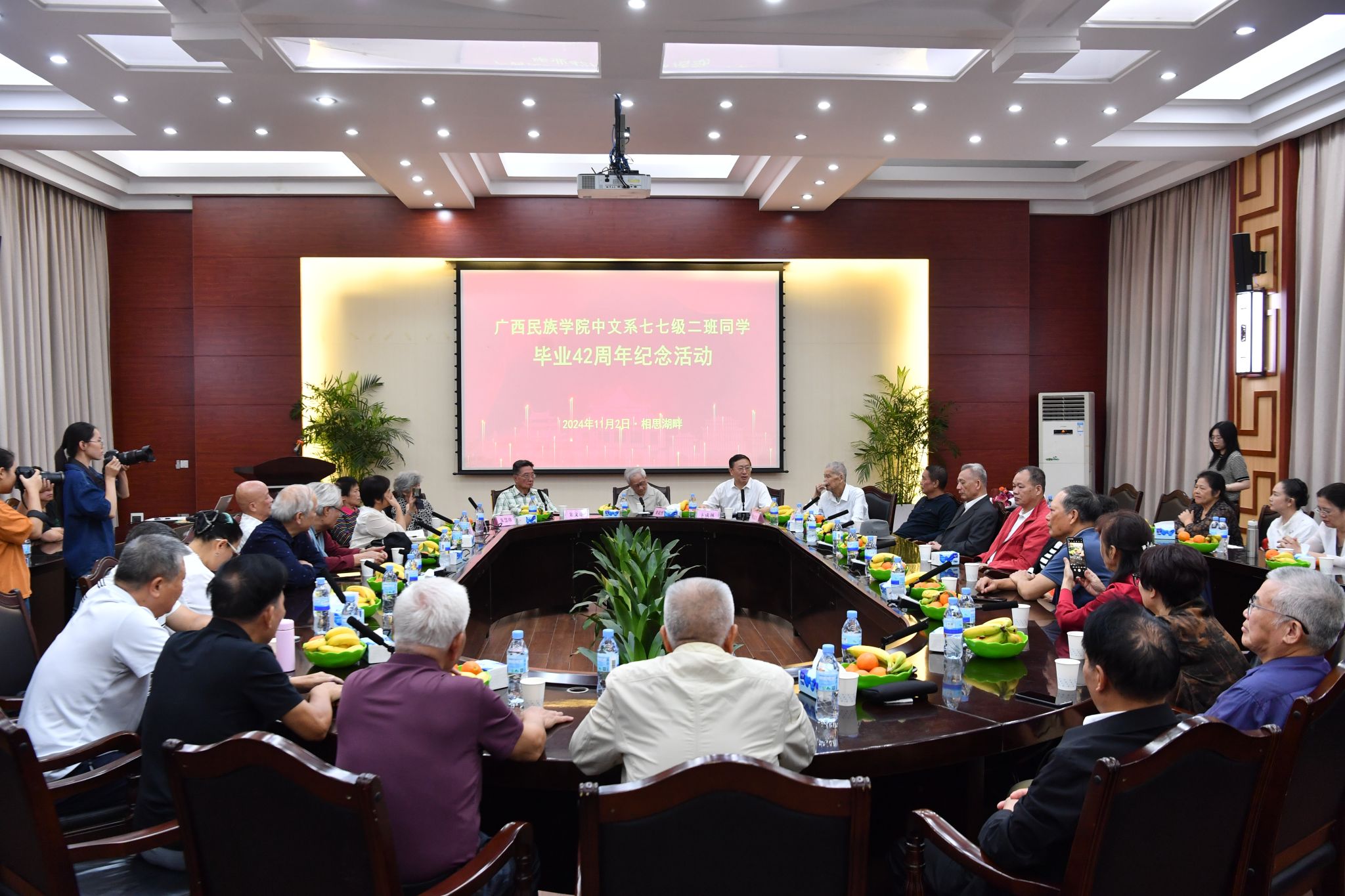 11月2日下午,我校举行原中文系1977级校友毕业42周年纪念座谈会,学校党委书记卞成林出席座谈会并讲话。中文系1977级2班班主任、自治区政协原副主席梁超然,中文系朱文雄、朱慧珍、林建华、归杰新等老领导、老教授、老同志和校友们齐聚一堂,畅叙师生情谊。