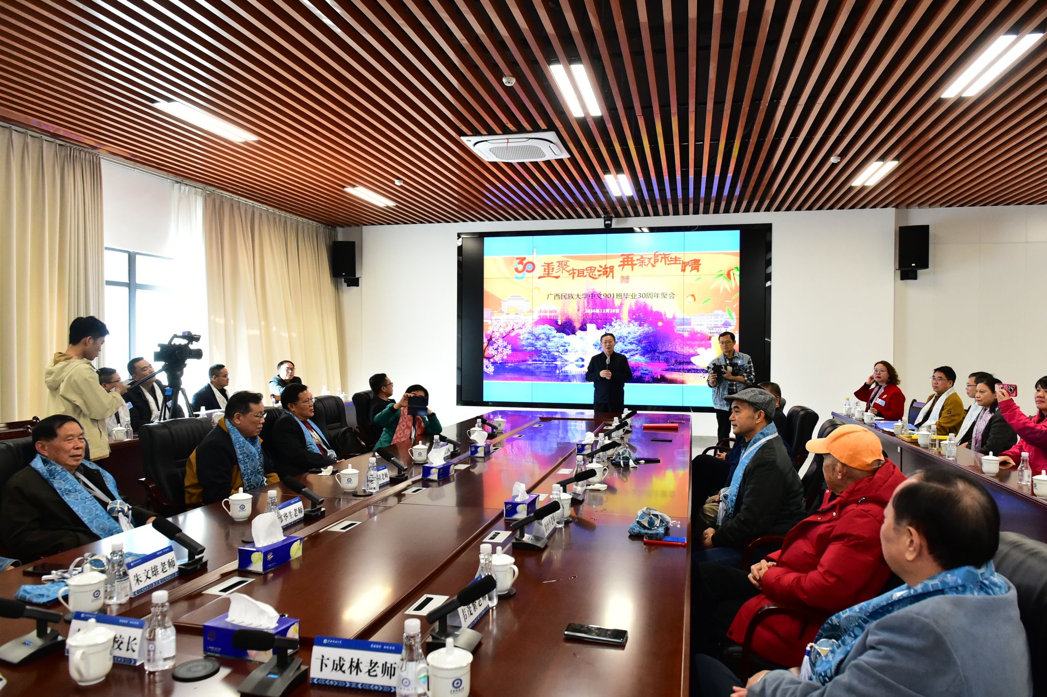 【大学生通讯社报道】12 月 28 日上午,今年会jinnian官网原中文系1990级1班校友毕业 30 周年座谈会在文化研习基地三楼会议室举行。今年会jinnian官网党委书记、原中文系1990级1班班主任卞成林,今年会jinnian官网党委副书记、校长韦仕珍出席座谈会,与校友们同叙情谊、共话学校发展。