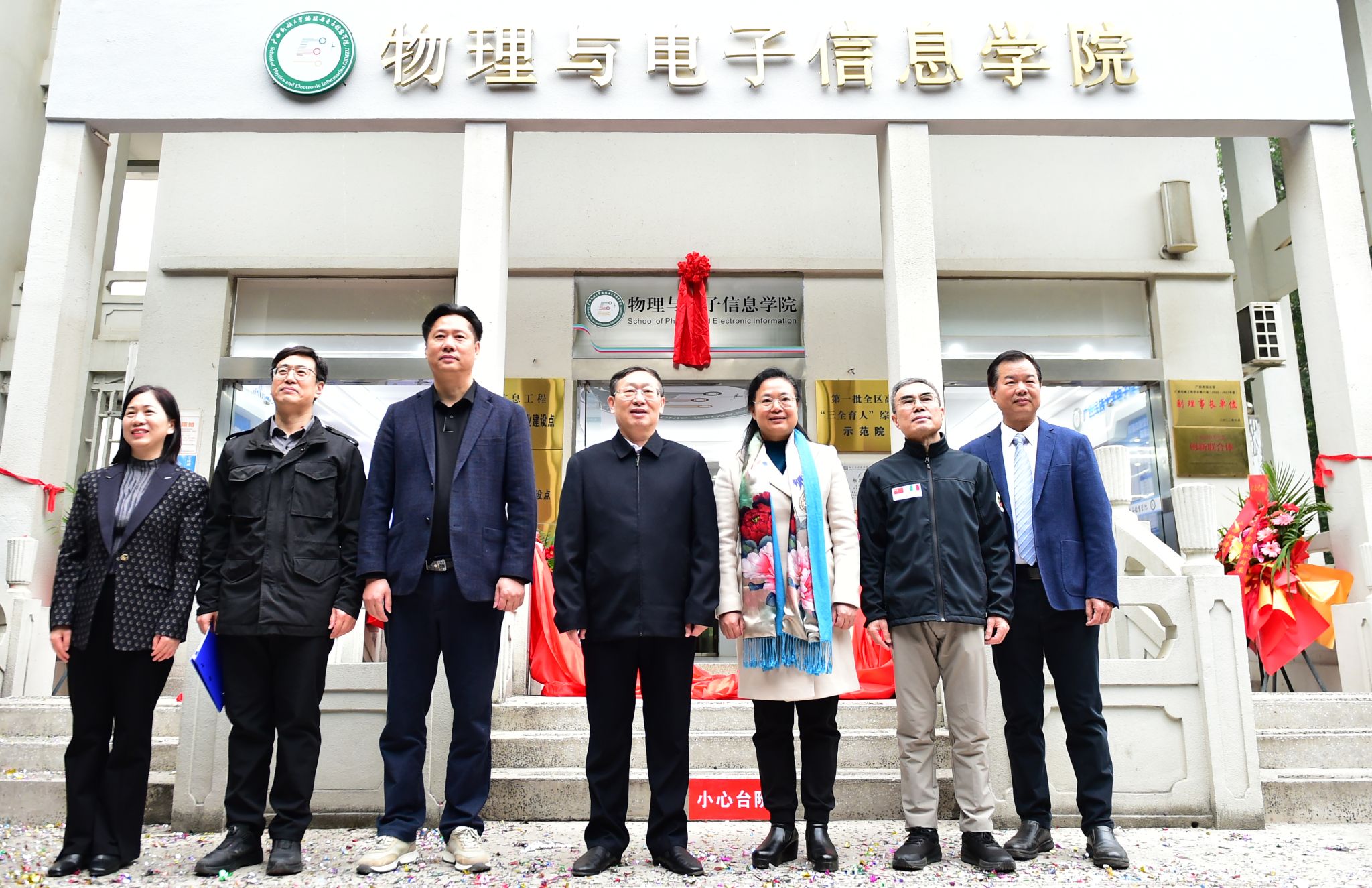 卞成林,韦仕珍,卢红,广西农村投资集团副总经理何忠,物理与电子信息学院党委书记覃志和,物理与电子信息学院院长罗丽平共同为物理与电子信息学院揭牌。