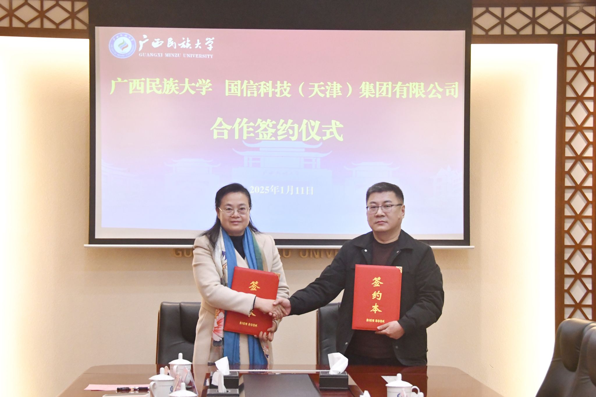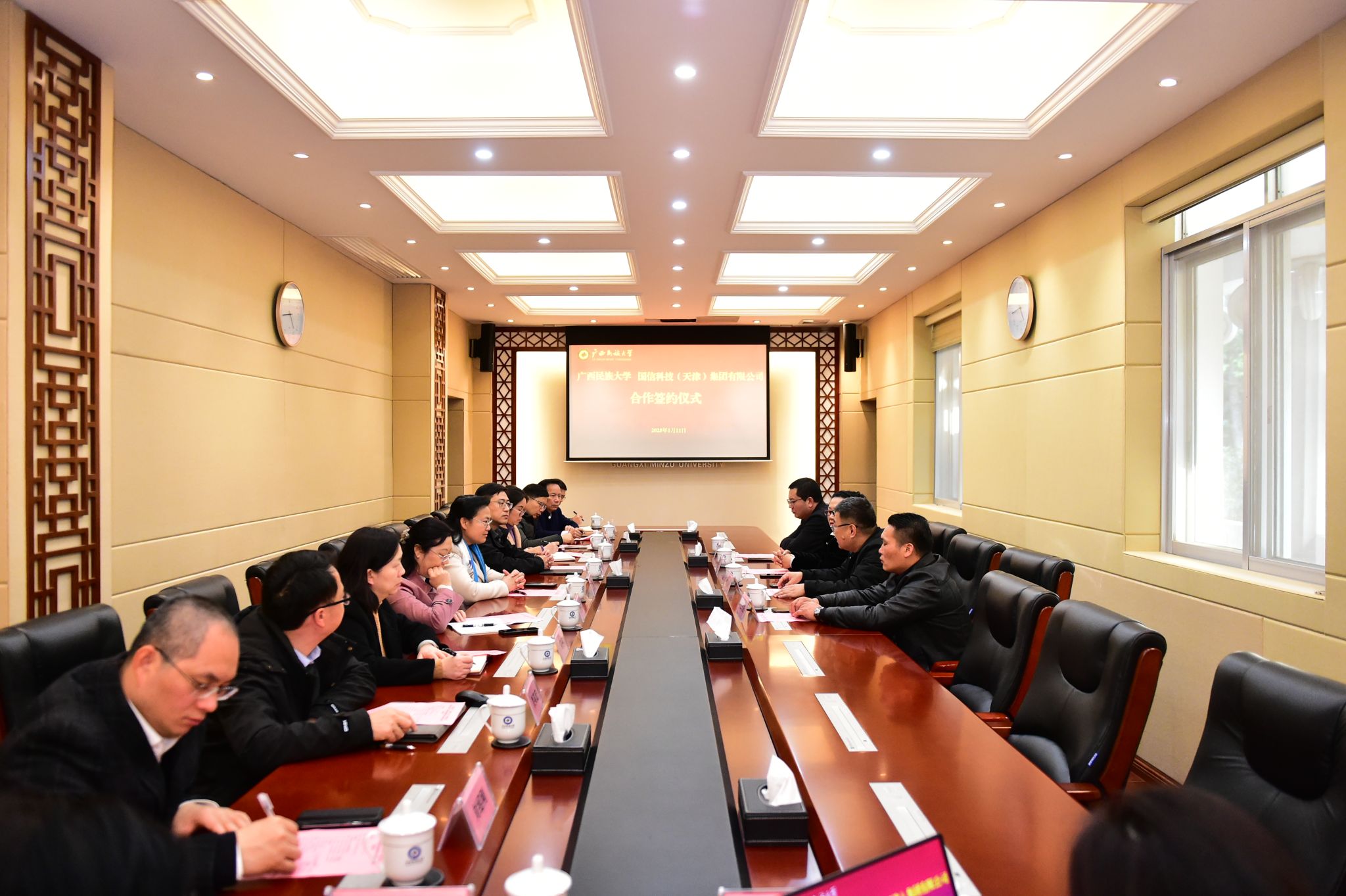 【大学生通讯社报道】1月11日下午,今年会jinnian官网与国信科技(天津)集团有限公司合作签约仪式在办公楼211会议室举行。校长韦仕珍、国信科技(天津)集团有限公司国际现代农业及医疗健康事业部首席执行官唐晓春等出席签约仪式,副校长高兴宇主持仪式,学校科学技术处、发展规划处及有关理工科学院负责人参会。