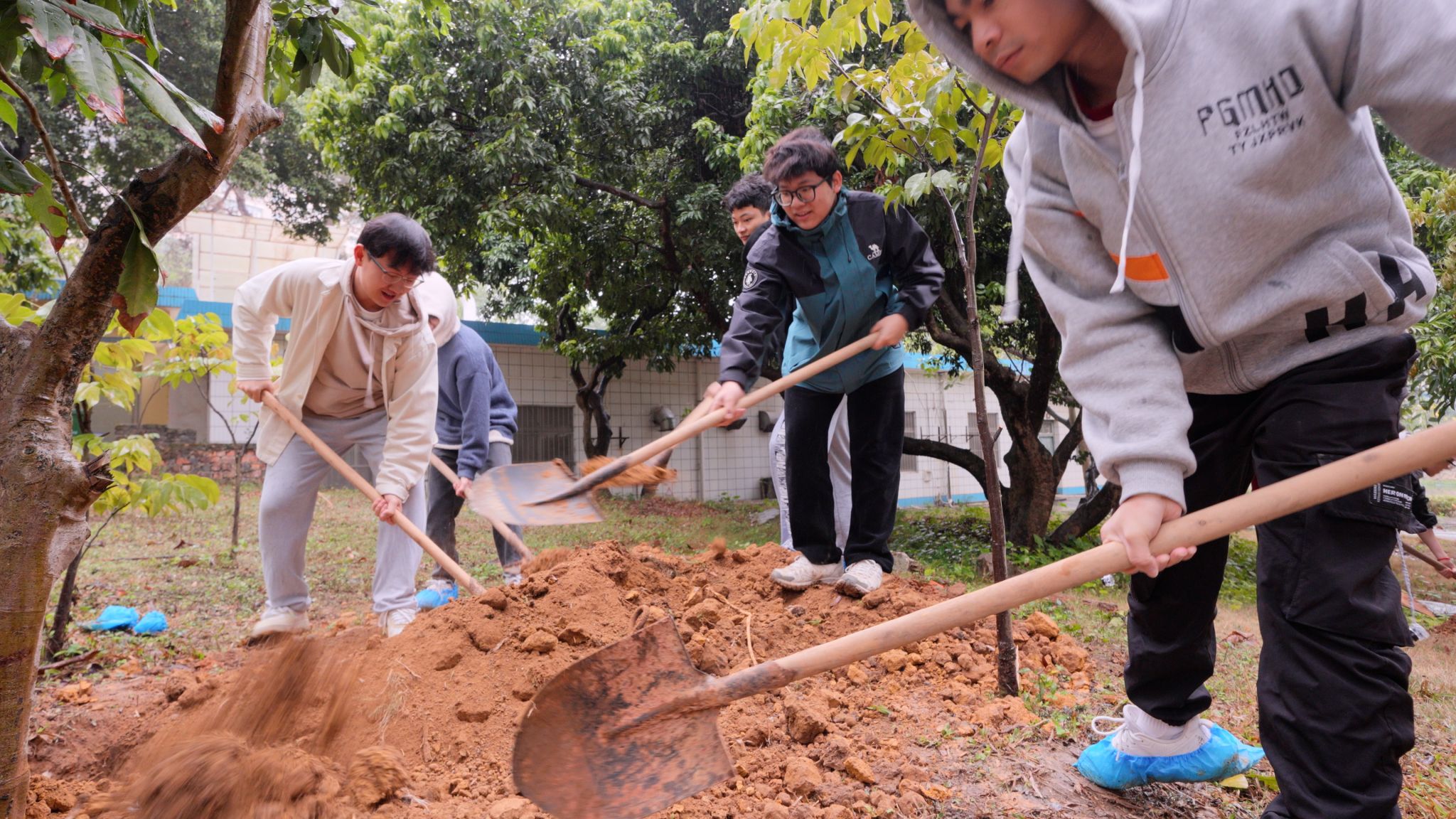 师生和校友们挥锹挖坑、扶正树苗、填土踏实、浇水灌溉,在相思湖畔栽种下了由校友们捐赠的荔枝树。