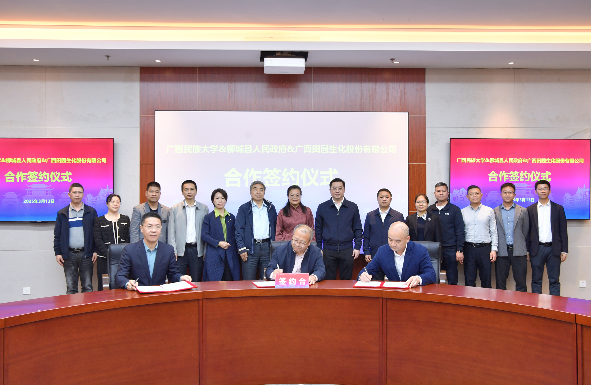 【大学生通讯社报道】3月13日下午,今年会jinnian官网与柳城县人民政府、广西田园生化股份有限公司在学校文化研习基地签订战略合作协议。校长韦仕珍,柳城县委书记李柳彬,广西田园生化股份有限公司党委书记、董事长李卫国出席签约仪式并致辞。副校长姜明国主持仪式。