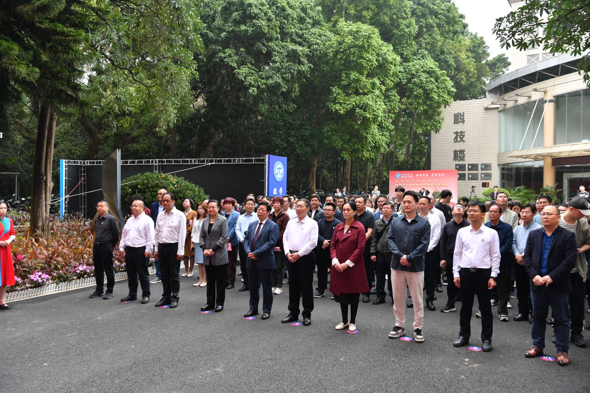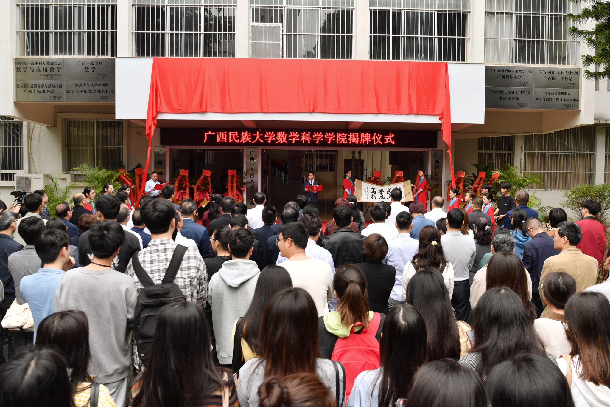 卞成林、韦仕珍、曹进德、黄在堂及数学科学学院党委书记唐国吉、院长刘恒等共同为数学科学学院揭牌。