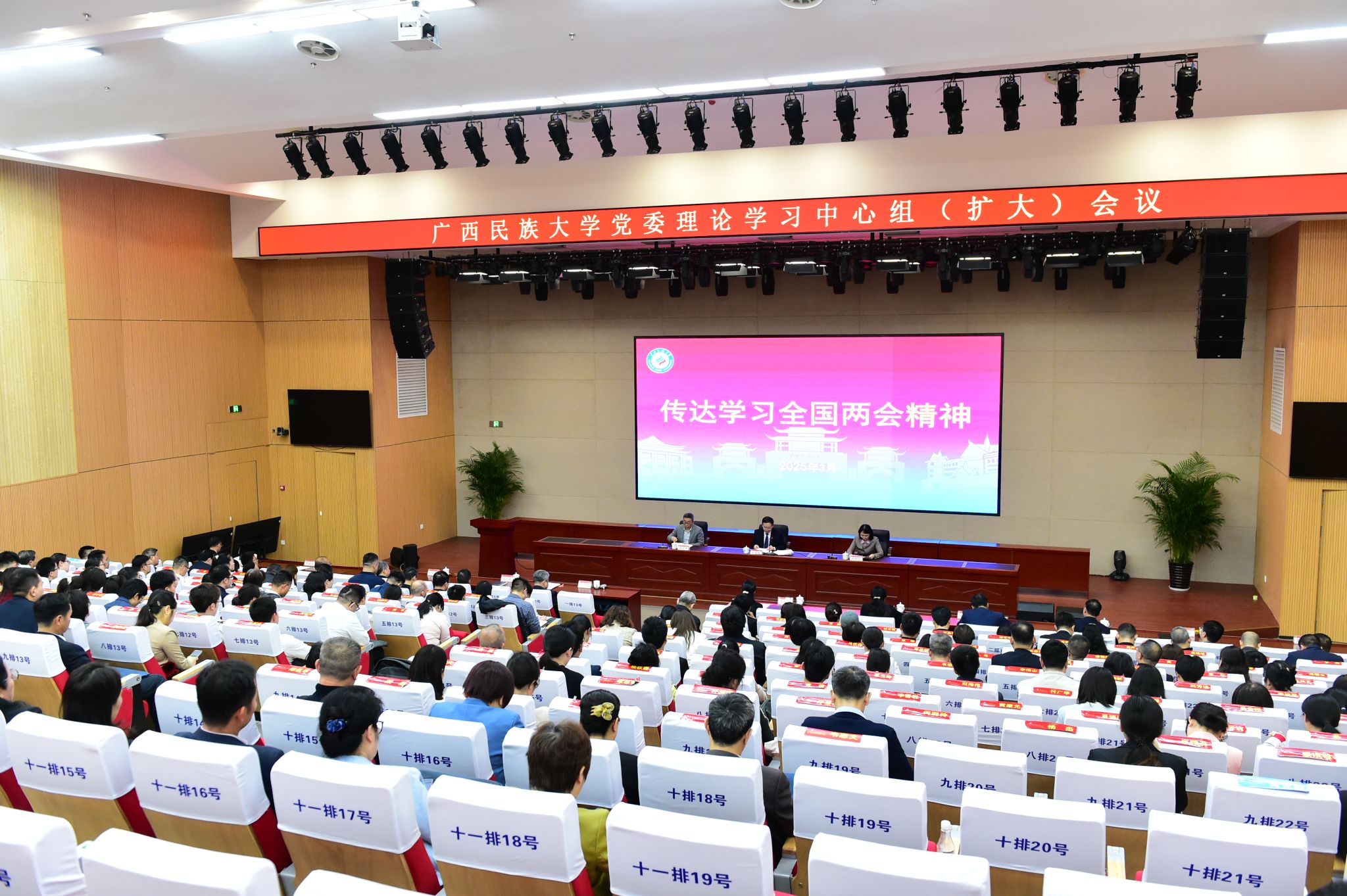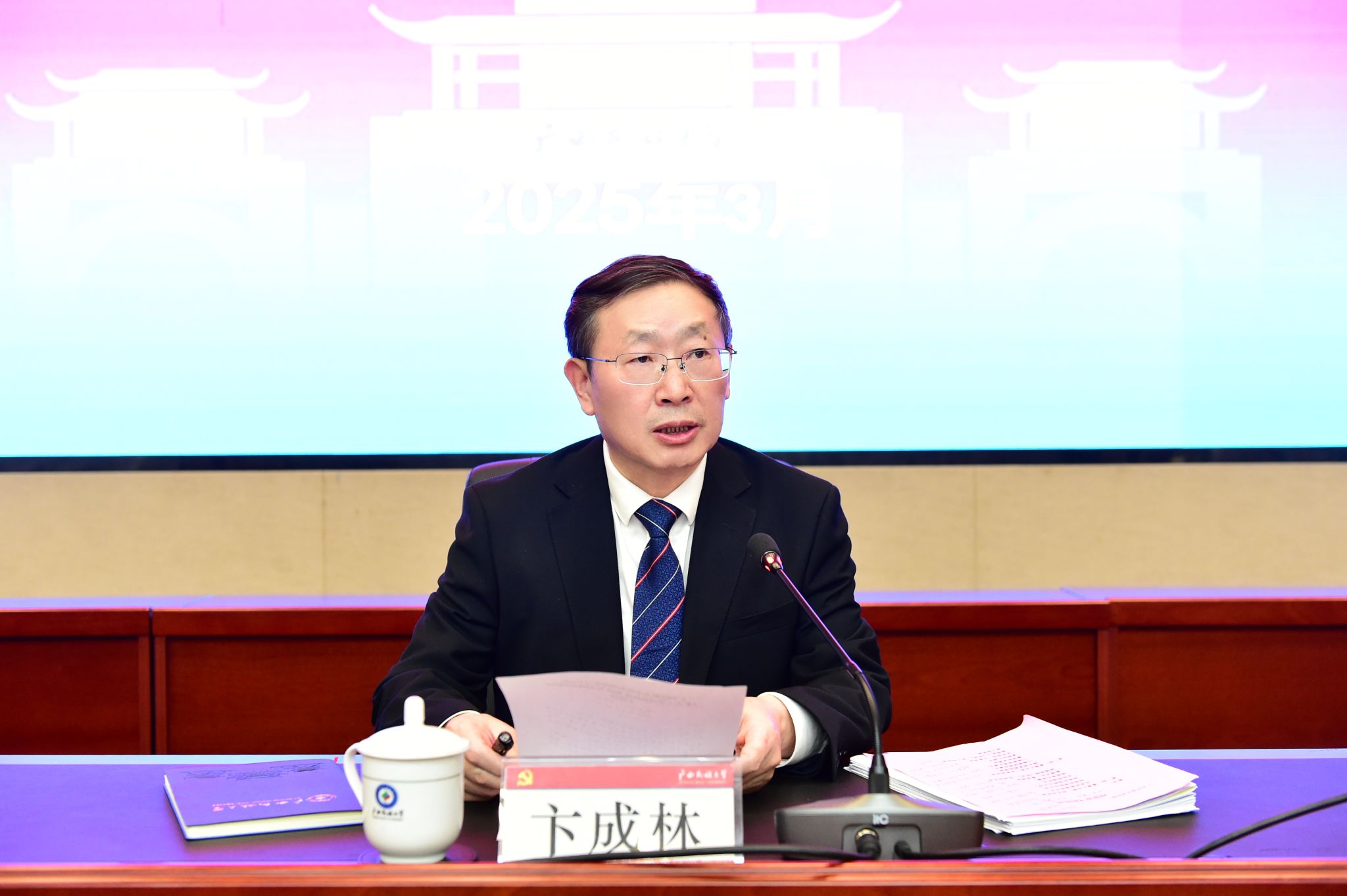 卞成林就学习贯彻全国两会精神提出要求,强调要切实深入学习好、领会好、贯彻好全国两会精神,特别是深入学习领会习近平总书记在全国两会期间发表系列重要讲话精神,把学习成果转化为旗帜鲜明讲政治的高度自觉,转化为推进学校改革发展稳定各项工作的强大动力。要扎实开展深入贯彻中央八项规定精神学习教育,筑牢干事创业的廉洁防线,以实际行动践行“实干为要、创新为魂,用业绩说话、让人民评价”。要在推动边疆民族地区高等教育高质量发展上展现更大作为,强化民族教育的使命担当,全面深化改革,推进治理体系与治理能力现代化,凝心聚力擘画学校事业内涵式高质量发展蓝图。