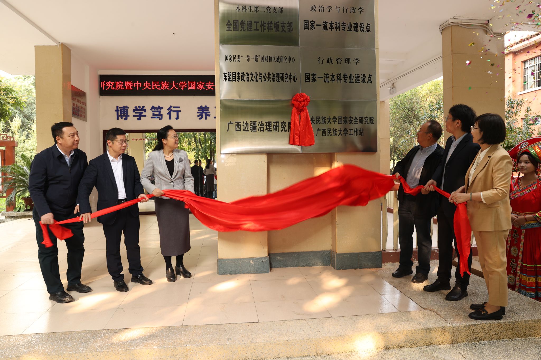 韦仕珍、邓国彬、李俊清、锁利铭及政治与公共管理学院党委书记罗源、院长胡佳共同为研究院和工作站揭牌。