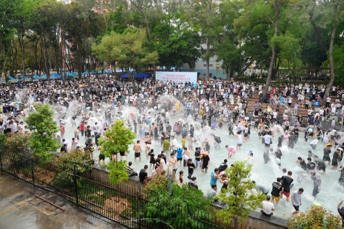动感的旋律响起,同学们互相泼水祝福,活动现场犹如一片欢快的海洋。