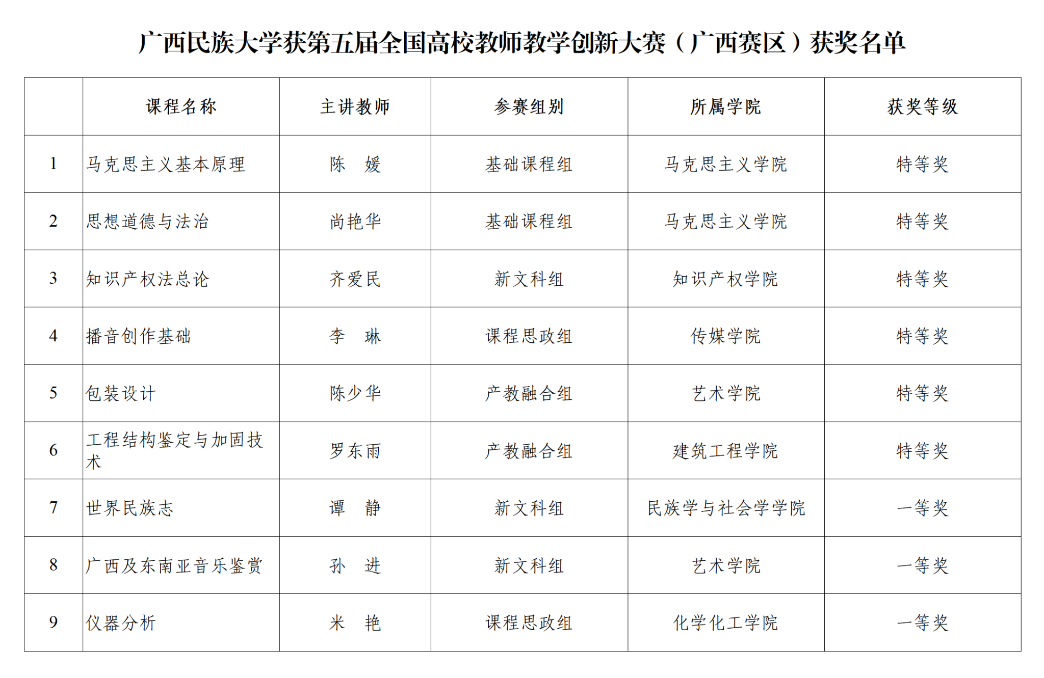 本次大赛中,我校各团队表现亮眼,马克思主义学院陈媛教师团队、尚艳华教师团队分获基础课程组特等奖,且在组内排名第一;知识产权学院齐爱民教师团队荣获新文科组特等奖,组内排名第一;传媒学院李琳教师团队荣获课程思政组特等奖,组内排名第一;艺术学院陈少华教师团队、建筑工程学院罗东雨教师团队分别荣获产教融合组特等奖,且在组内位列第一、第二。以上6个团队凭借出色表现,均获推代表广西高校参加第五届全国高校教师教学创新大赛(全区共19个参赛团队可参加国赛)。