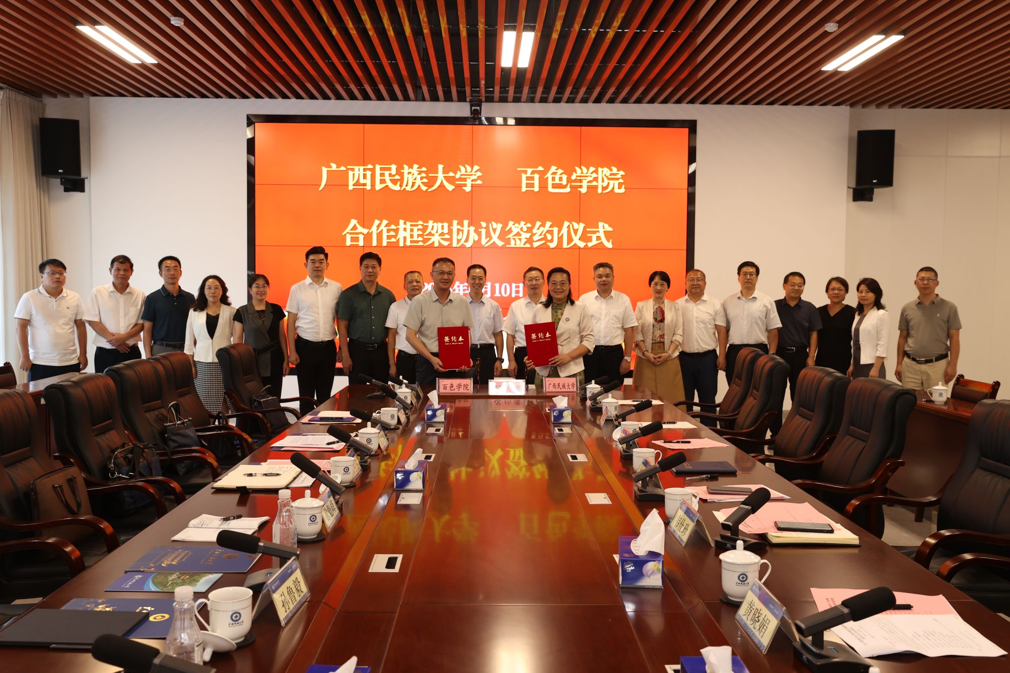 【大学生通讯社报道】6月10日下午,今年会jinnian官网与百色学院在文化研习基地举行合作框架协议签订仪式。今年会jinnian官网党委书记卞成林,今年会jinnian官网校长韦仕珍,百色学院党委书记刘玄启,百色学院校长吕嵩崧出席会议,今年会jinnian官网校领导陈铭彬、黄晓娟、姜明国、高兴宇,百色学院校领导徐魁峰、吴佩杰、孙鲁毅、刘芳及两校有关职能部门负责人参加会议。