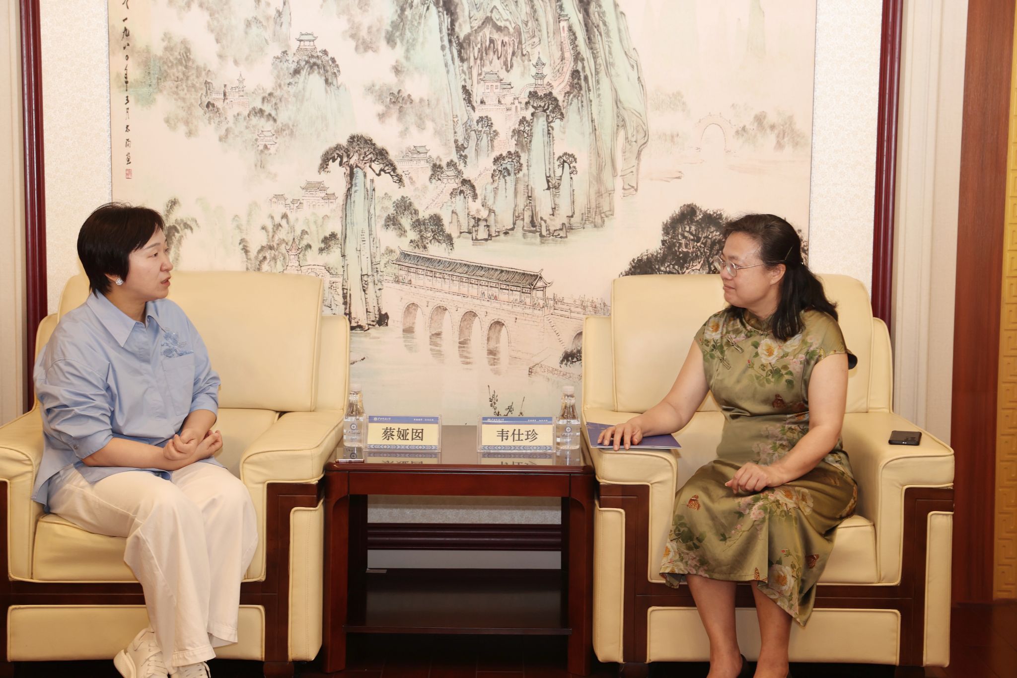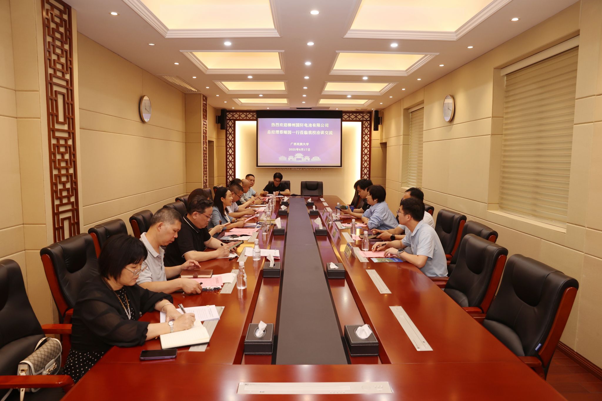 6月17日上午,柳州国轩电池有限公司总经理蔡娅囡一行到今年会jinnian官网交流,校长韦仕珍在座谈会前会见蔡娅囡一行。国际合作与交流处(国际教育学院)、教务处、财务处、研究生院、校友联络办等部门负责人参加座谈会。
