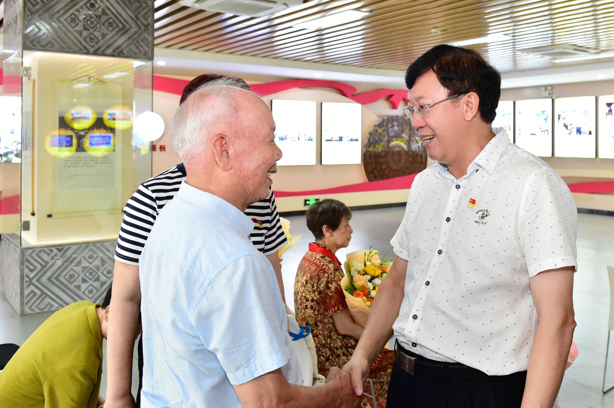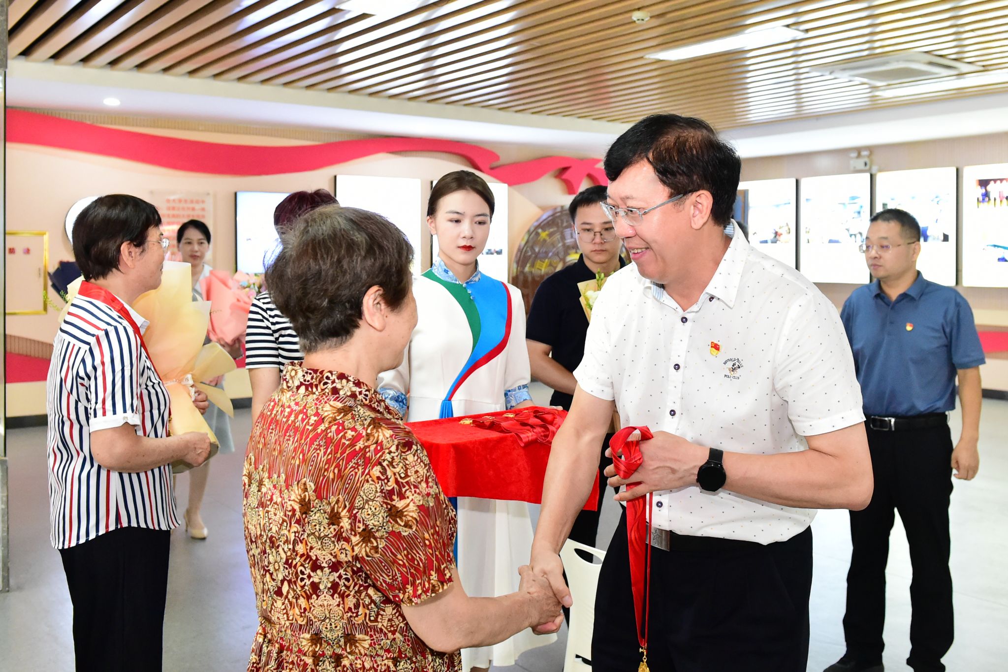 仪式上,唐平秋为到场的12位老党员颁发纪念章,并合影留念。