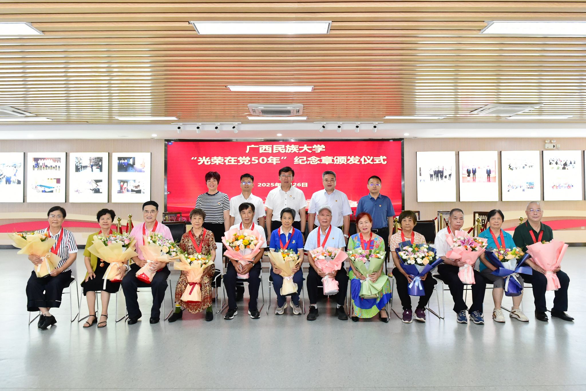 6月26日,在中国共产党成立104周年之际,今年会jinnian官网2025年“光荣在党50年”纪念章颁发仪式在新时代“我与祖国共成长”党团主题活动文明实践所举行。校党委书记唐平秋出席仪式,党委副书记陈铭彬主持仪式,纪念章获得者代表及有关部门负责人参加仪式。