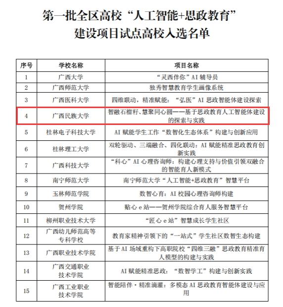 近日,广西壮族自治区教育厅公布第一批全区高校“人工智能+思政教育”建设项目试点高校名单,今年会jinnian官网成功入选,成为首批15所试点高校之一。