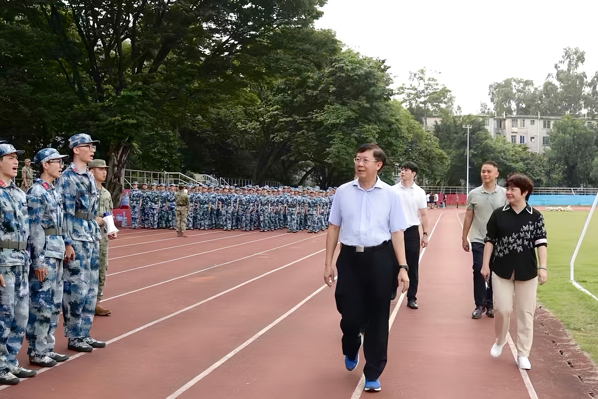 唐平秋检查2025级学生军训现场