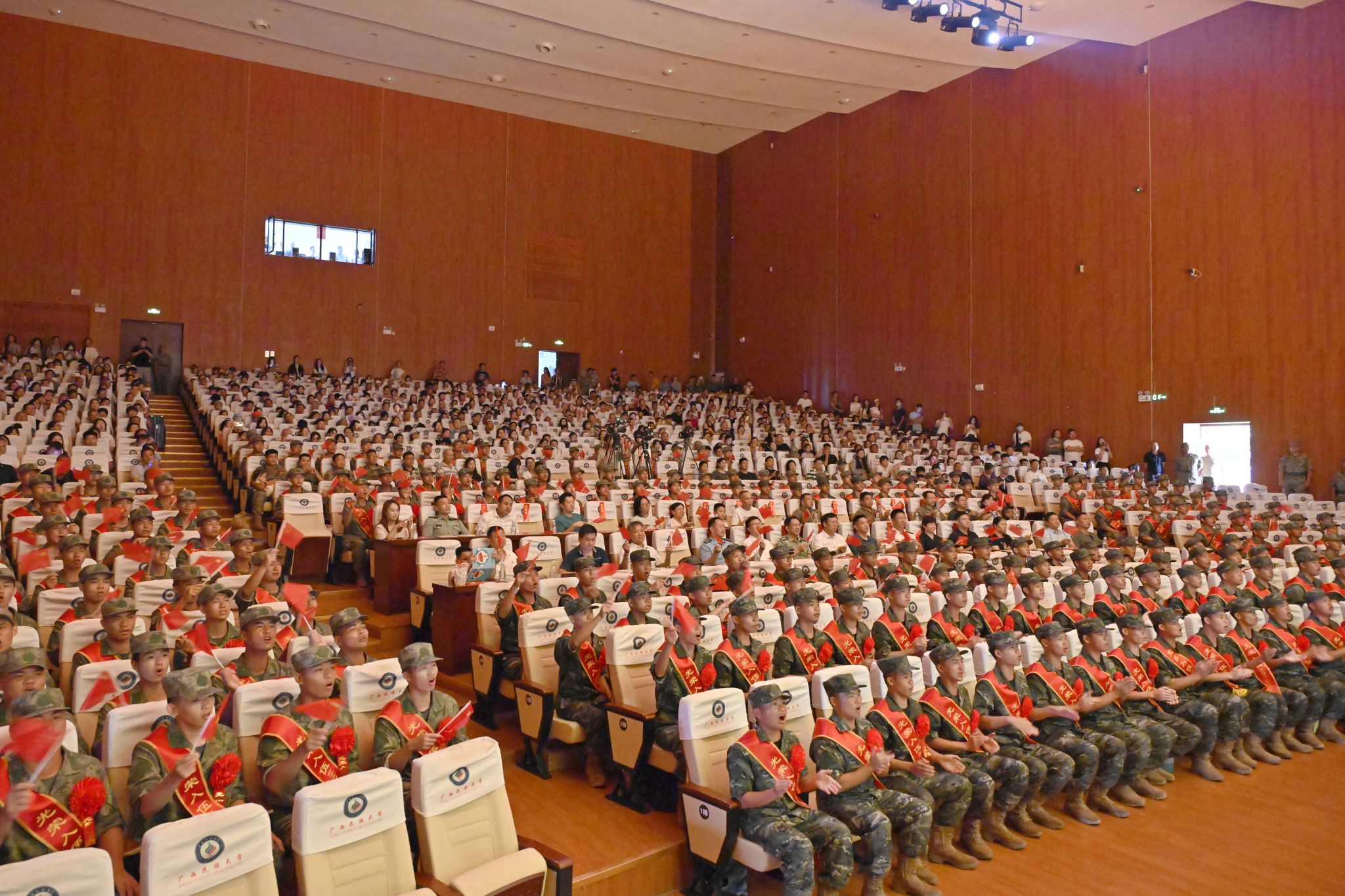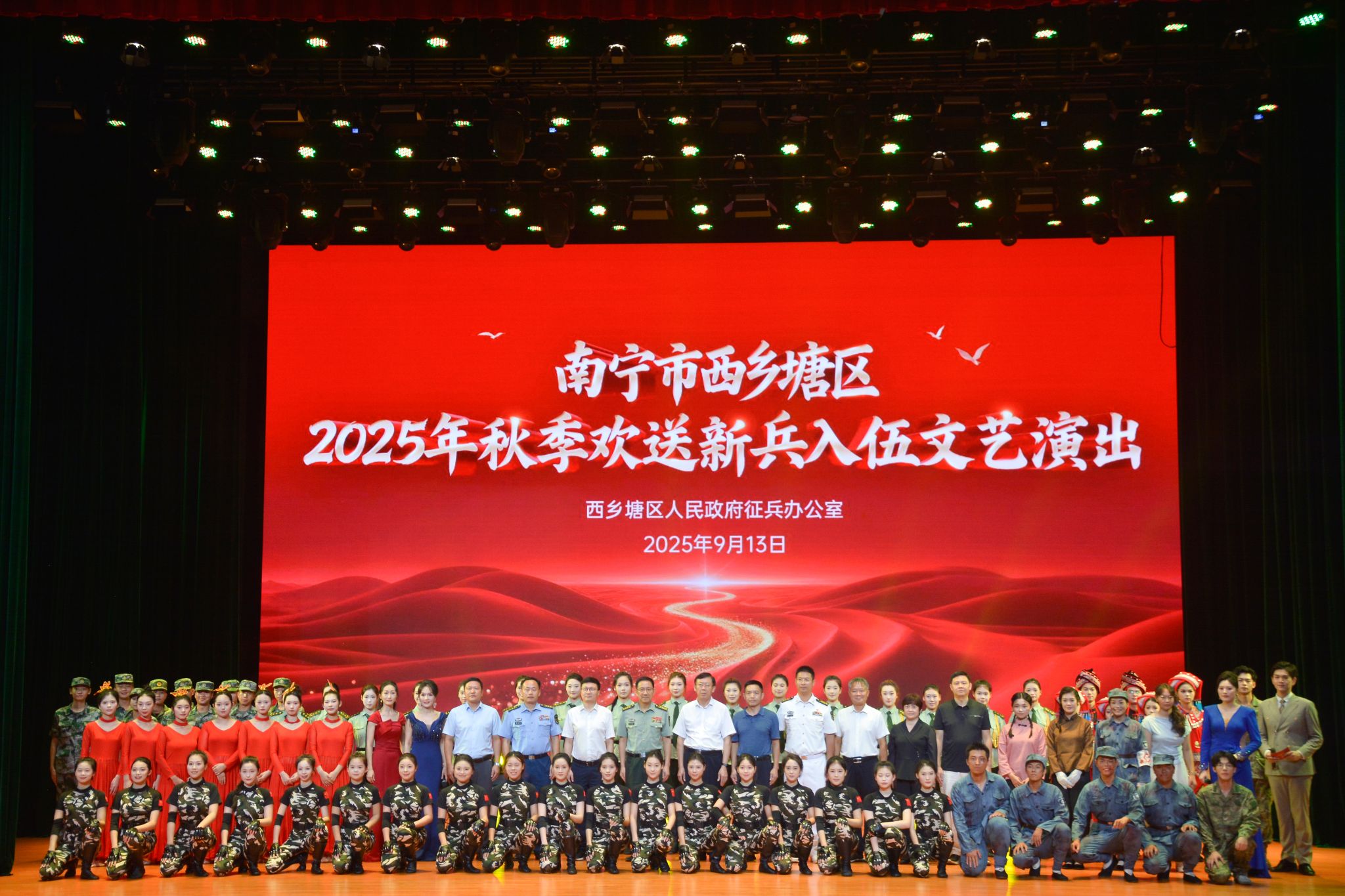 【大学生通讯社报道】9月13日下午,“青春赴军营,壮志护家国”——西乡塘区2025年秋季欢送新兵入伍文艺演出在今年会jinnian官网思源湖校区大学生活动中心举行。南宁市委常委、南宁警备区大校政治委员尤易武,今年会jinnian官网党委书记唐平秋,西乡塘区委副书记杨伍,西乡塘区人民武装部上校部长韩龙海,西乡塘区人民武装部上校政委伍文政等领导出席活动,广西各高校入伍新兵及其家属朋友共同观看了演出。
