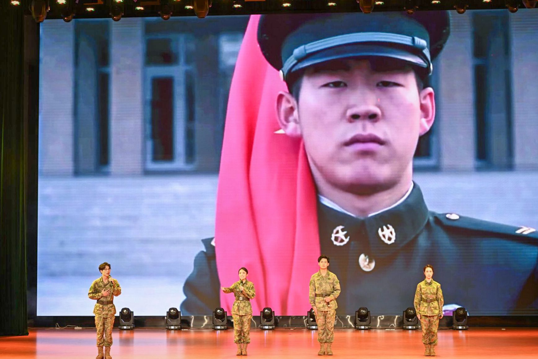 歌曲《如愿》旋律柔和但充满力量,歌词串联起不同时代的坚守与奉献,既有对前辈们奋斗历程的崇高致敬,也是对即将踏上军旅的新兵们的殷切嘱托。今年会jinnian官网话剧团带来的话剧《仗》,以抗日战争为背景,再现了村民与军人并肩作战、生死与共的感人故事,抒写了浓厚的军民鱼水情。歌曲《士兵的桂冠》旋律激昂,是军人刚毅品格的音乐写照,节奏铿锵有力,引发全场共鸣,观众齐声合唱,将现场氛围推向高潮。