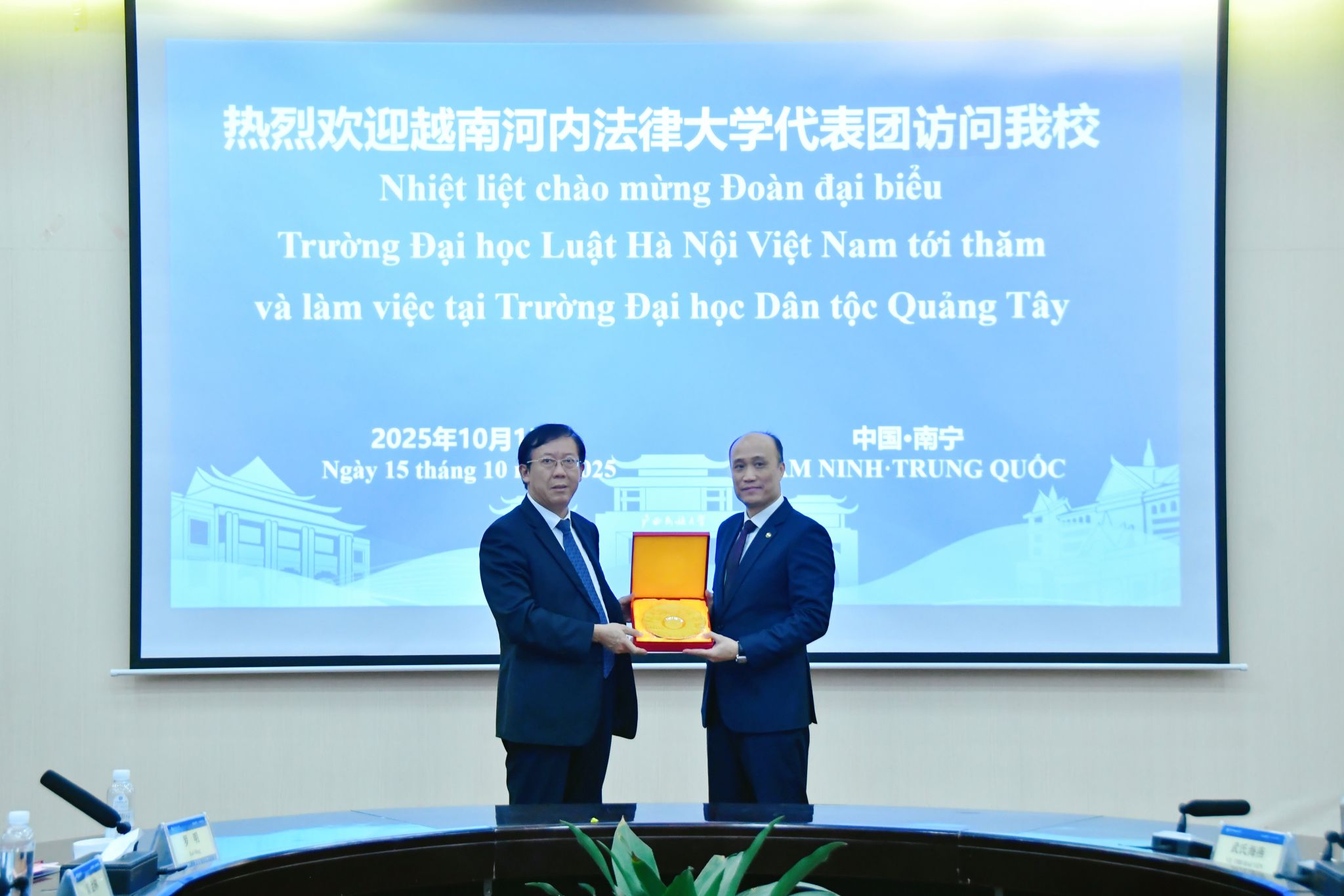 会后,双方互赠纪念品并合影留念。(初审:罗明 编辑:韦丽娜 复审:韦利坤 终审:孙寿媚)