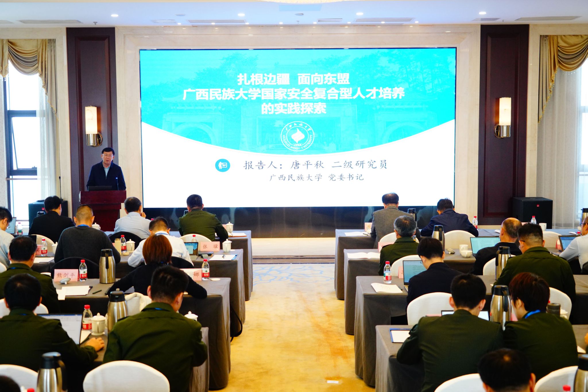 唐平秋从以“边疆+东盟”双使命定义人才培养方向、多体系联动夯实人才培养建设基础等方面,系统介绍了我校围绕“懂边疆治理、通东盟事务、精安全实务”目标,探索“扎根南疆固根基、面向东盟拓视野、跨域融合强能力”的国家安全复合型人才培养实践。并指出,学校深化“边疆安全+东盟特色”育人模式,从国家安全特色学科群打造、创新团队建设、校地协同与成果转化等方面持续发力,为新时代国家安全体系和能力现代化、中国-东盟命运共同体建设培养“靠得住、用得上、留得下”的复合型人才。