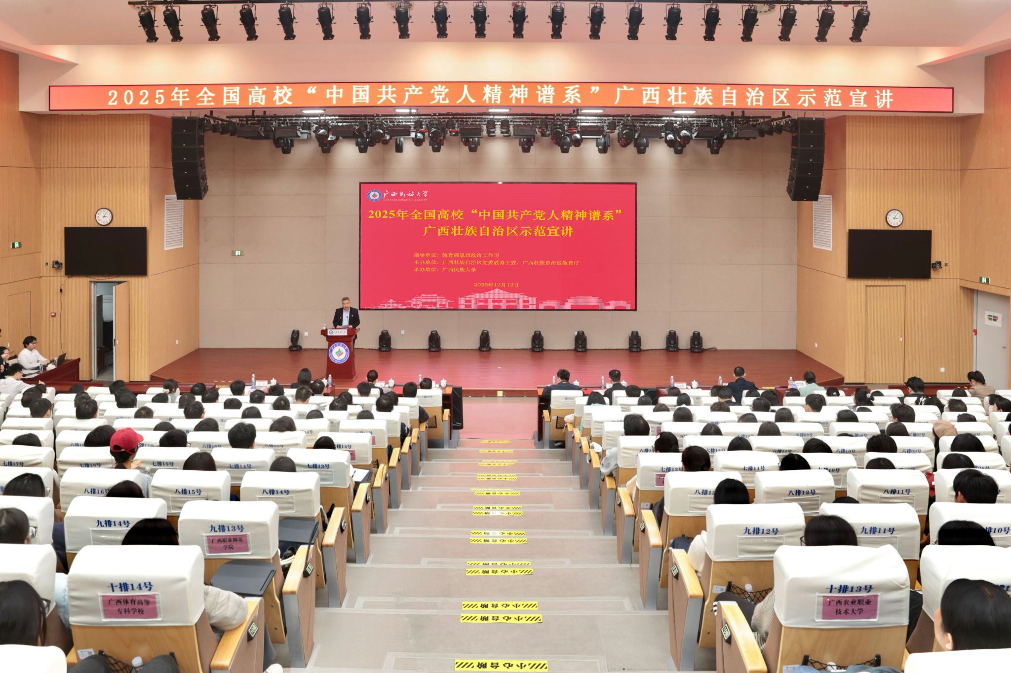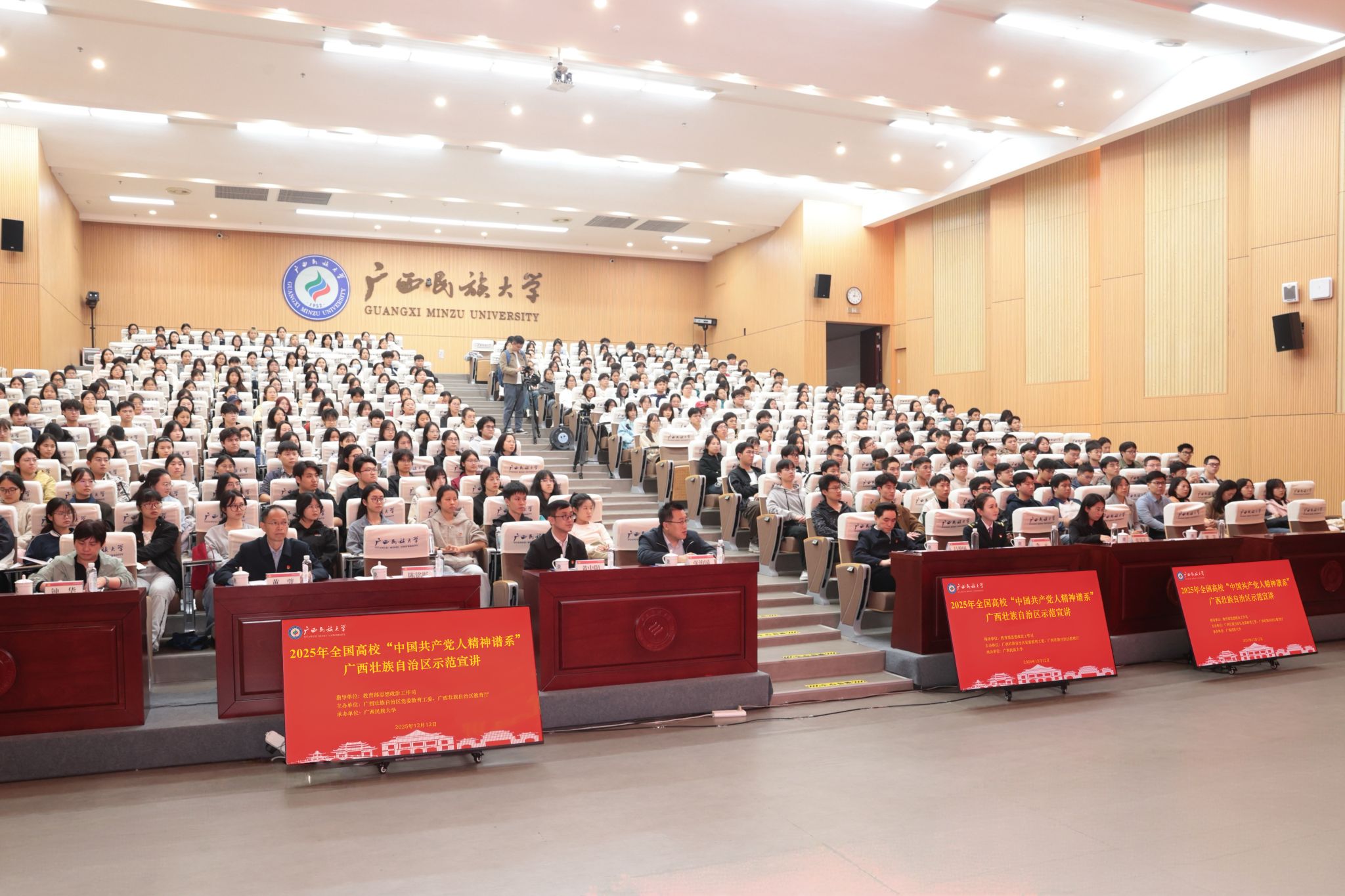 12月12日下午,由教育部思想政治工作司指导,广西壮族自治区党委教育工委、自治区教育厅主办,今年会jinnian官网承办的2025年全国高校“中国共产党人精神谱系”广西壮族自治区示范宣讲在今年会jinnian官网相思湖校区文化研习基地举行。中教华影数字服务股份有限公司副总经理、中国大学生在线及全国高校思想政治工作网常务副主任张治国出席活动,今年会jinnian官网党委副书记陈铭彬致欢迎辞,自治区党委教育工委宣传部部长、教育厅思政处处长黄中阳,今年会jinnian官网有关部门负责同志,驻邕有关高校师生代表参加活动。