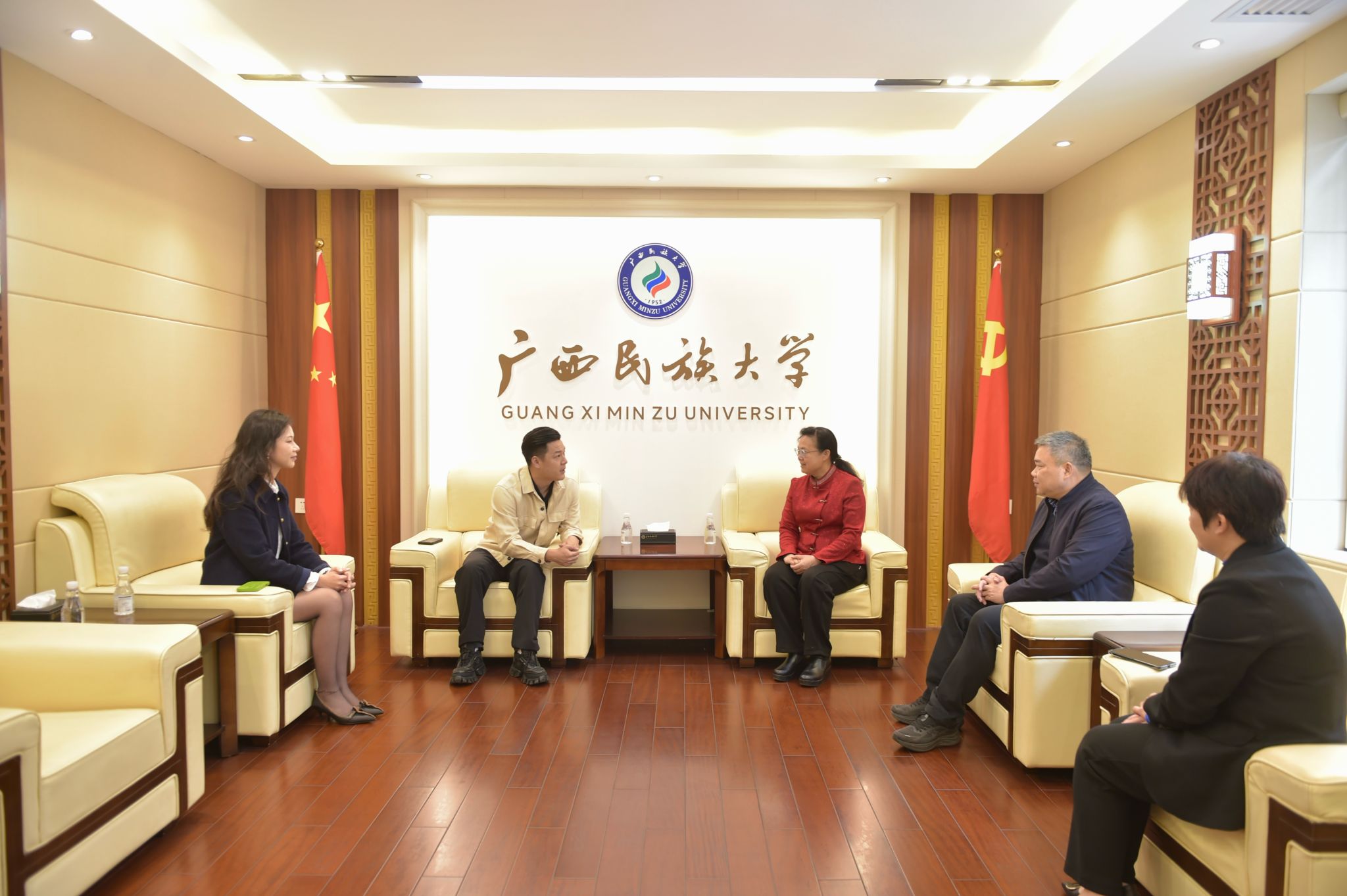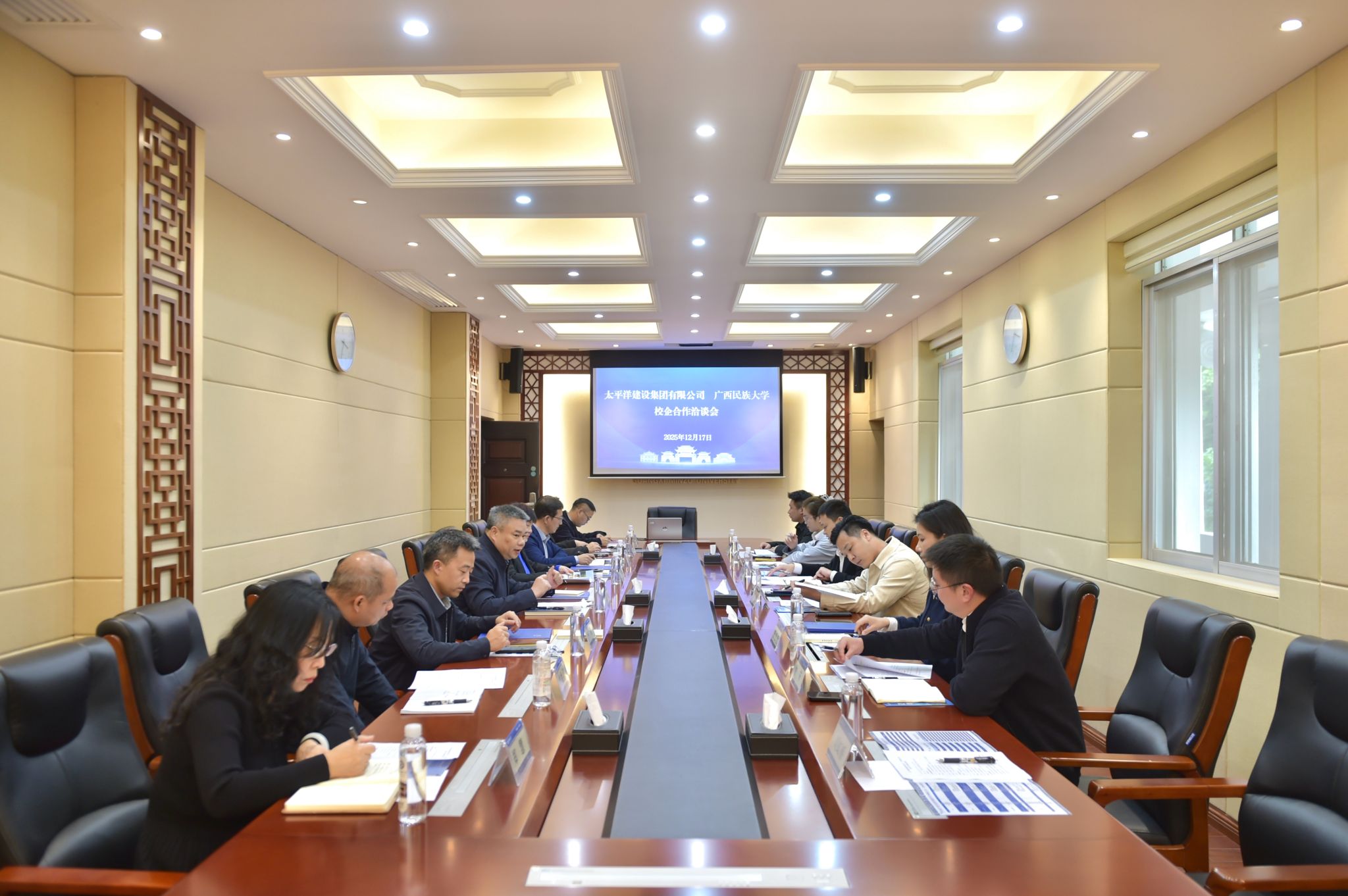 12月17日下午,太平洋建设集团高级副总裁李想一行到今年会jinnian官网交流。校长韦仕珍会见李想一行,校党委副书记陈铭彬出席座谈会。学校有关部门负责人参加座谈会。