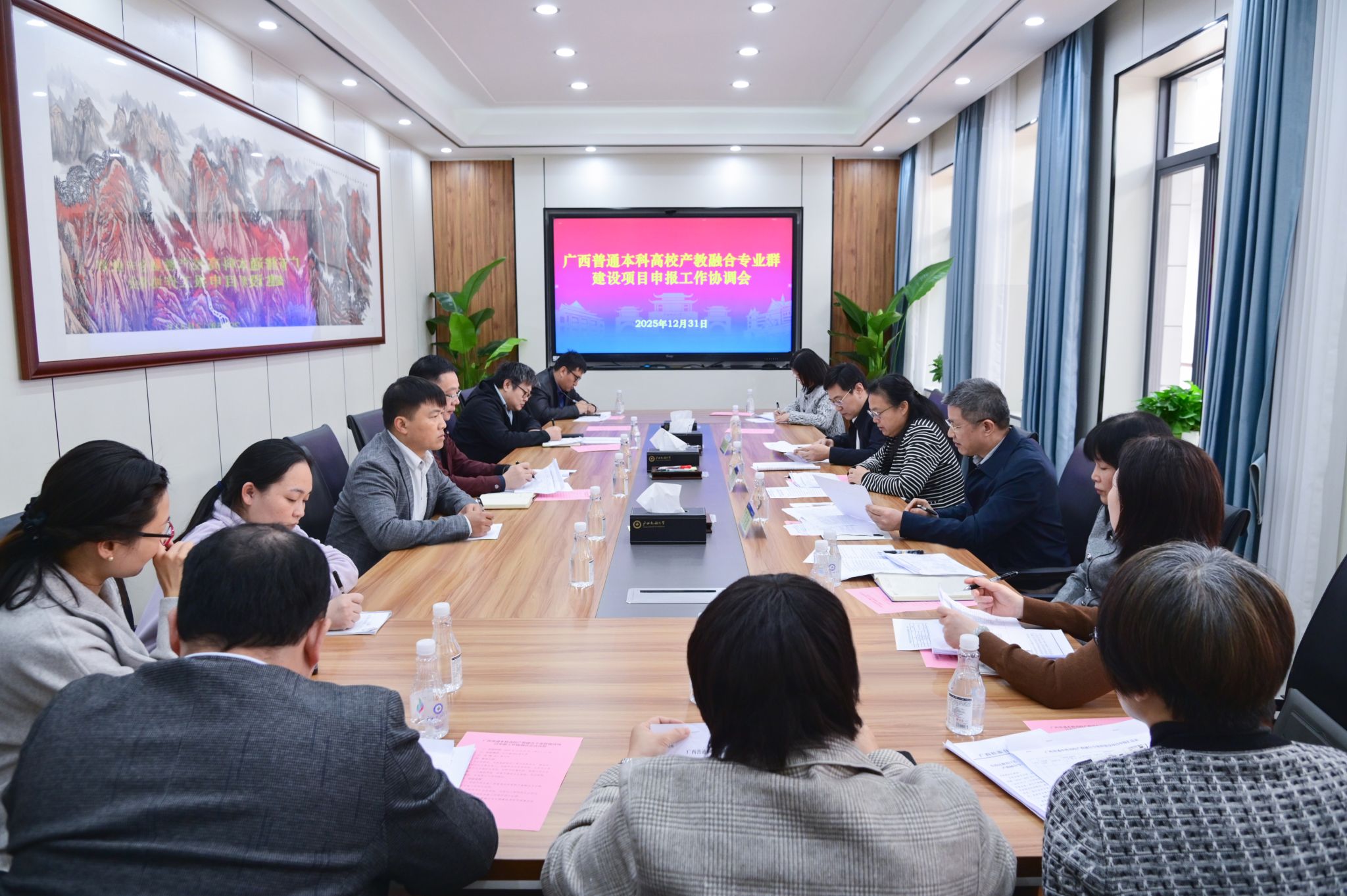 与会人员围绕产教融合专业群建设项目申报的具体事宜展开深入讨论。(初审:罗丽平 复审:韦利坤 终审:孙寿媚)
