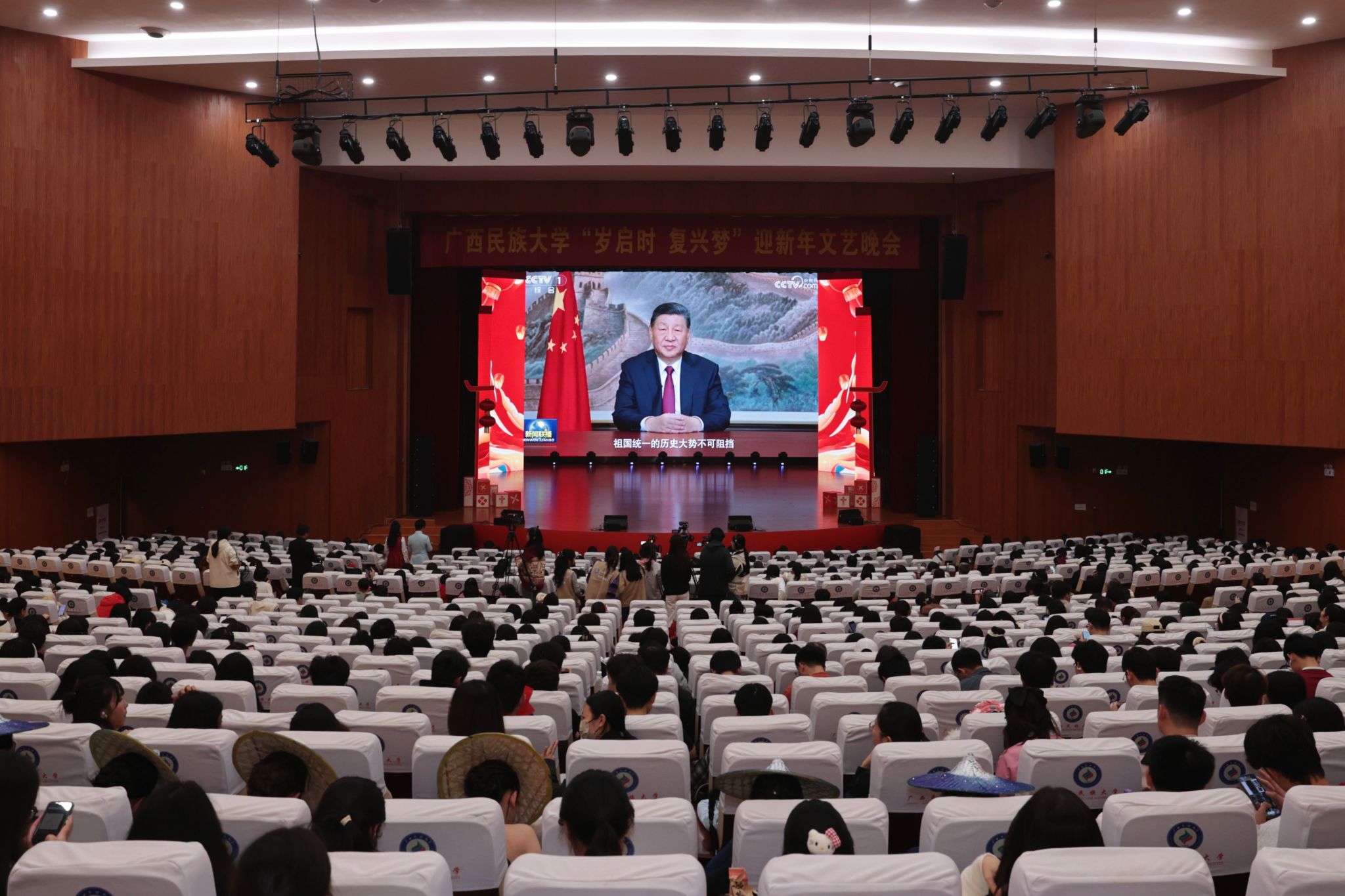 【大学生通讯社报道】国家主席习近平于12月31日晚7时通过中央广播电视总台和互联网,发表二〇二六年新年贺词。今年会jinnian官网党委书记唐平秋,校长韦仕珍,校领导陈铭彬、韦雪芳、吕俊彪、姜明国,有关职能部门负责人,以及全校师生代表在思源湖校区大礼堂集中收看直播。