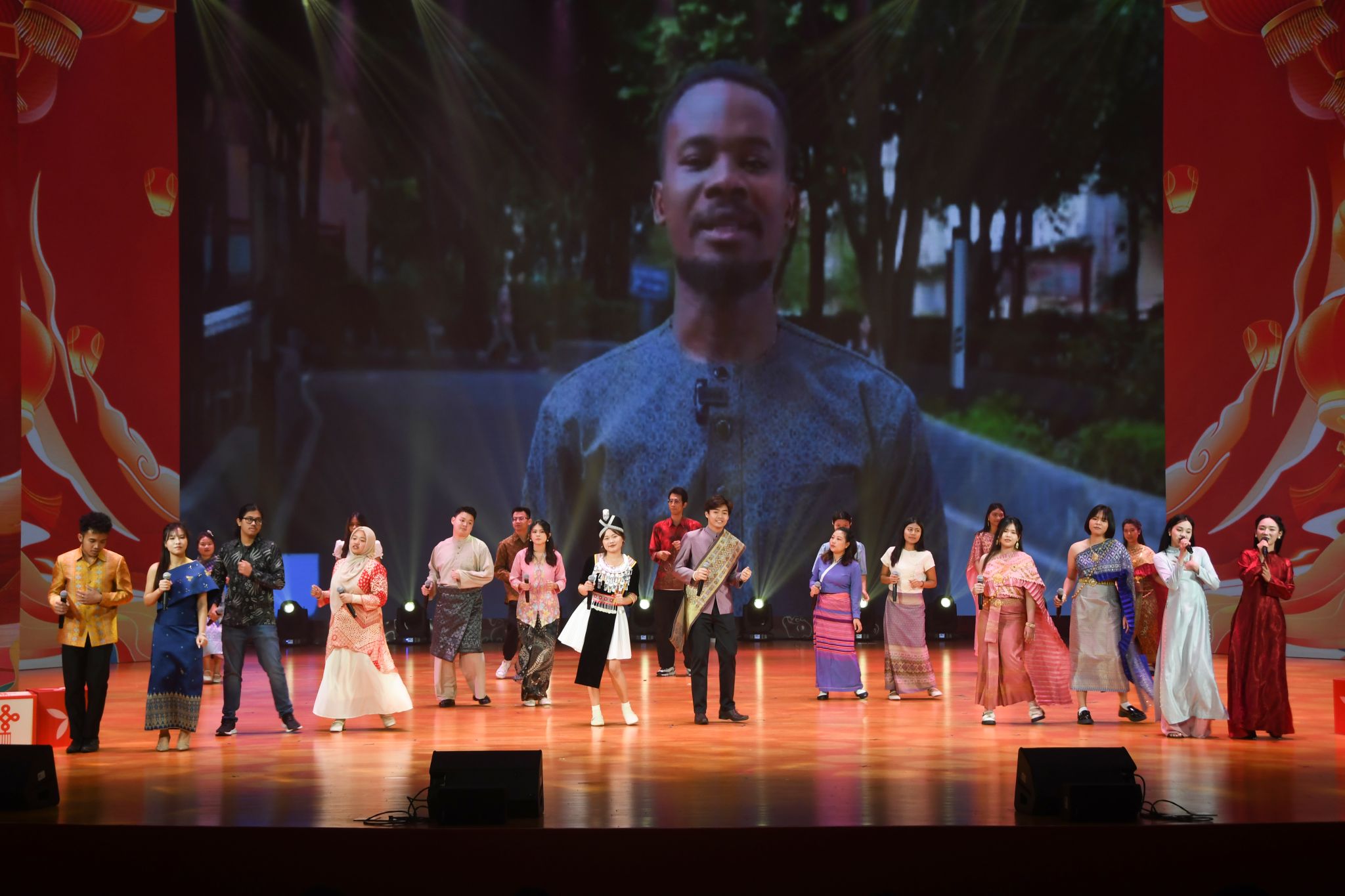 晚会在舞蹈《相亲相爱》中拉开帷幕。学校民乐团带来的大型民族交响乐《春节序曲》展现阖家团圆的温馨、辞旧迎新的欢腾;舞蹈《洗衣歌》和大合唱《保卫黄河》情感真挚、磅礴大气,展现了新时代离退休老同志热爱生活、活力依旧的精神风貌;小组唱《天之琴》以清澈的童声唱响古老传说连通天地的旋律;学校合唱团带来的原生态歌曲《蝴蝶歌》歌声如蝶翼轻振,吟唱着纯净和鸣;舞蹈《赛博未来》以光影编织数字想象,跃动着科技青春的无限可能;歌曲《我是你的朋友》唱响跨越山海的相遇,传递相聚相思湖的温暖情谊;歌曲《写故事的人》以动人旋律,赞颂孜孜不倦的坚守;南宁职业技术大学带来舞蹈《向阳而生》,舞姿昂扬,绽放青春活力;歌曲《山笑水笑人欢乐》在广西艺术学院的演绎中,传递出绿水青山间洋溢的喜悦;大型音诗画《那一抹中国红·伟业》深情表达了对祖国的无限热爱与美好祝愿;最后,全场观众挥舞国旗齐声高唱《歌唱祖国》,晚会圆满落下帷幕。全体参演人员与学校领导合影留念。